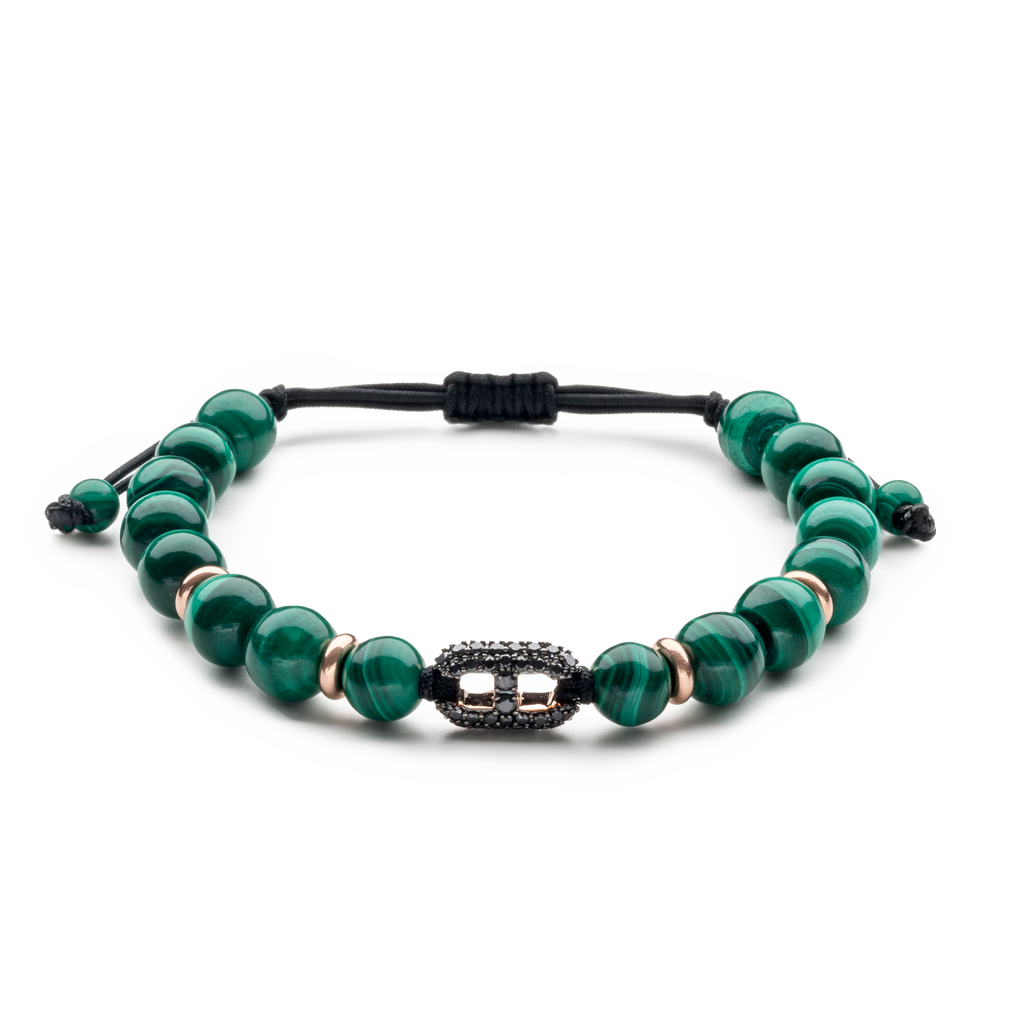 18K rose gold bracelet, malachite, 32 stones, large black diamond link, Adjustable nylon cord from 15cm to 25cm
