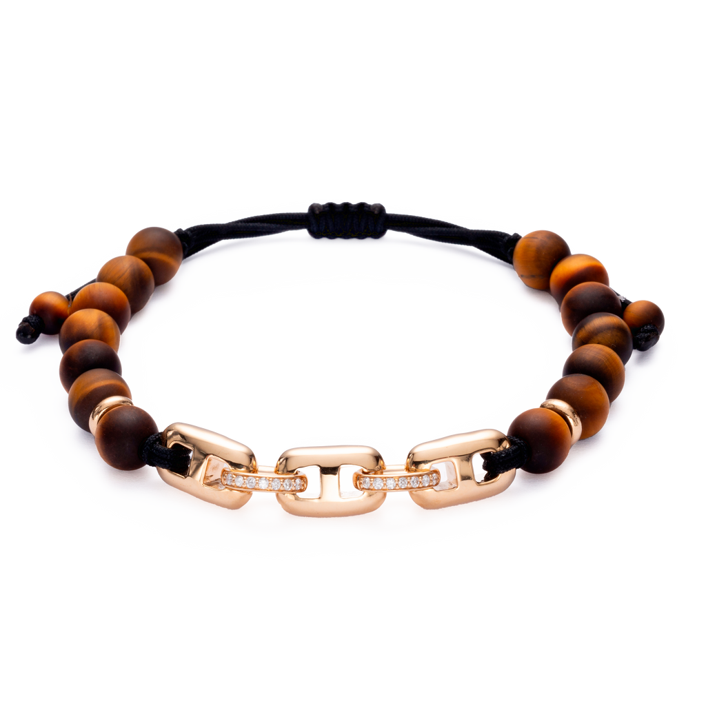 18K yellow gold bracelet, tiger eye, 30 stones, triple diamond link, Adjustable nylon cord from 15cm to 25cm