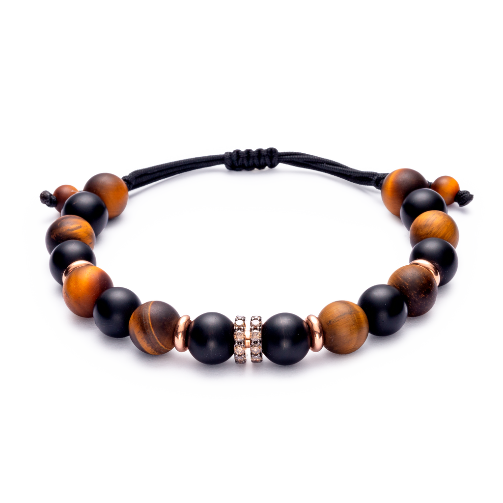 18K rose gold bracelet, tiger eye, 20 stones, double-wheel black diamond, Adjustable nylon cord from 15cm to 25cm