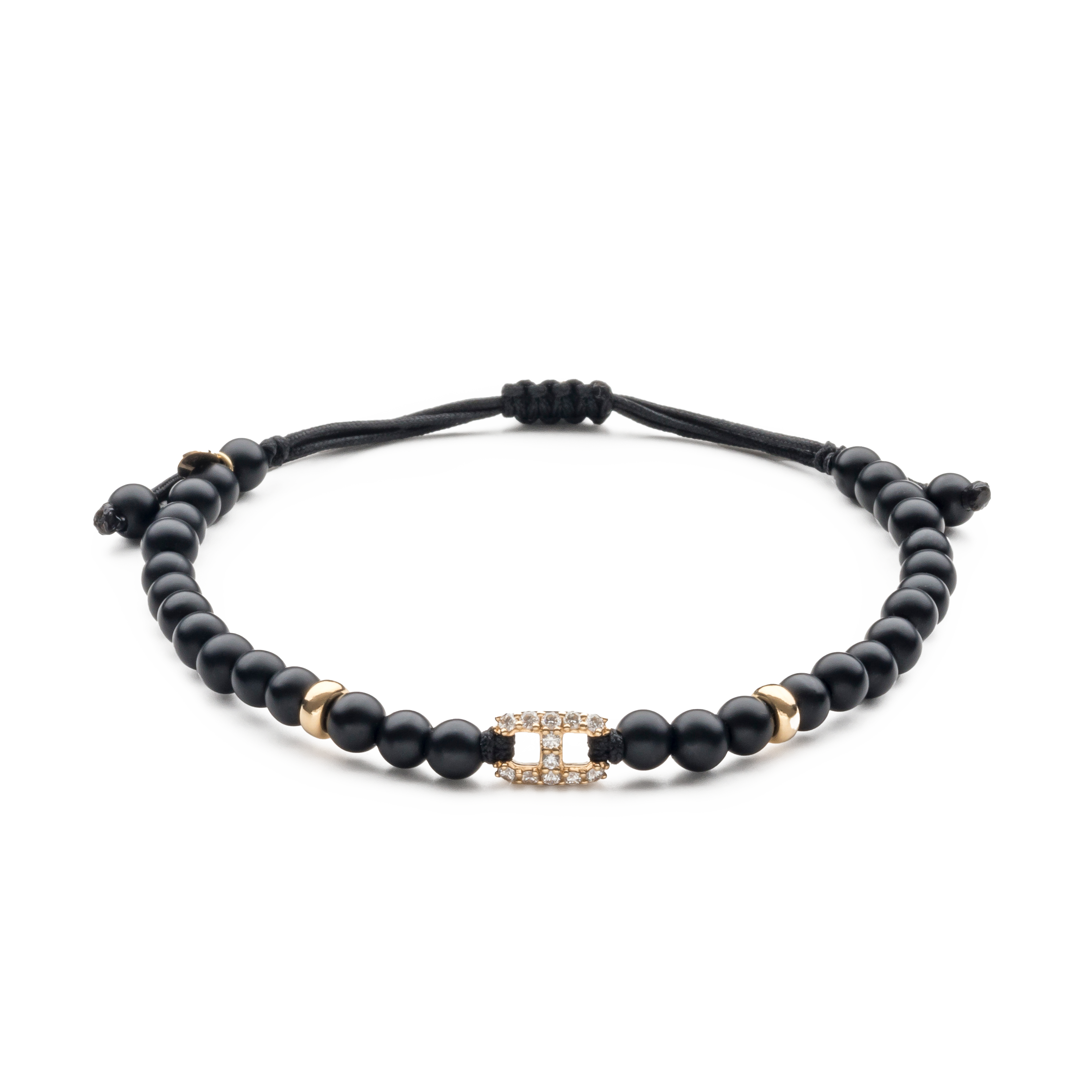 18K rose gold bracelet, onyx, 12 stones, diamond link, Adjustable nylon cord from 15cm to 25cm
