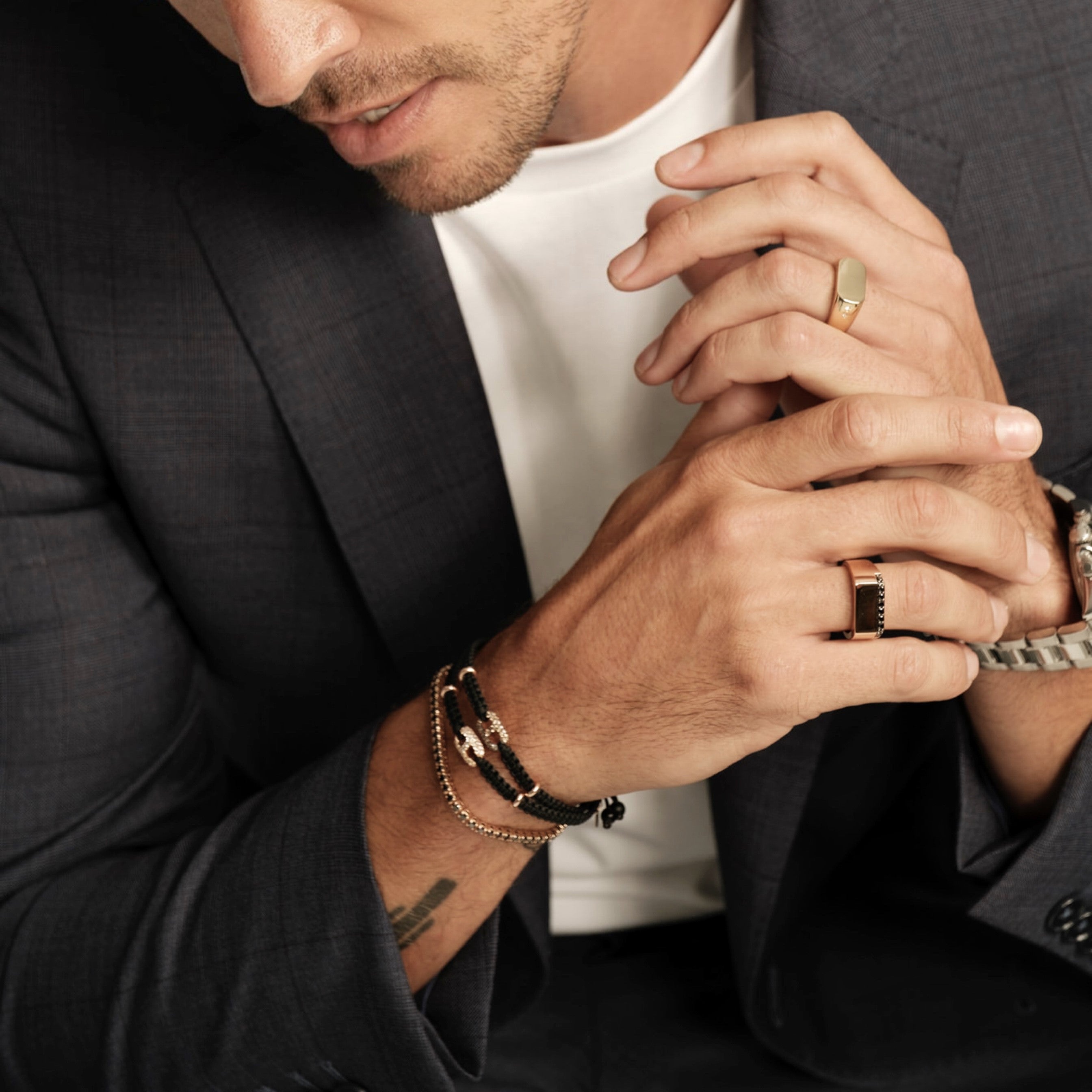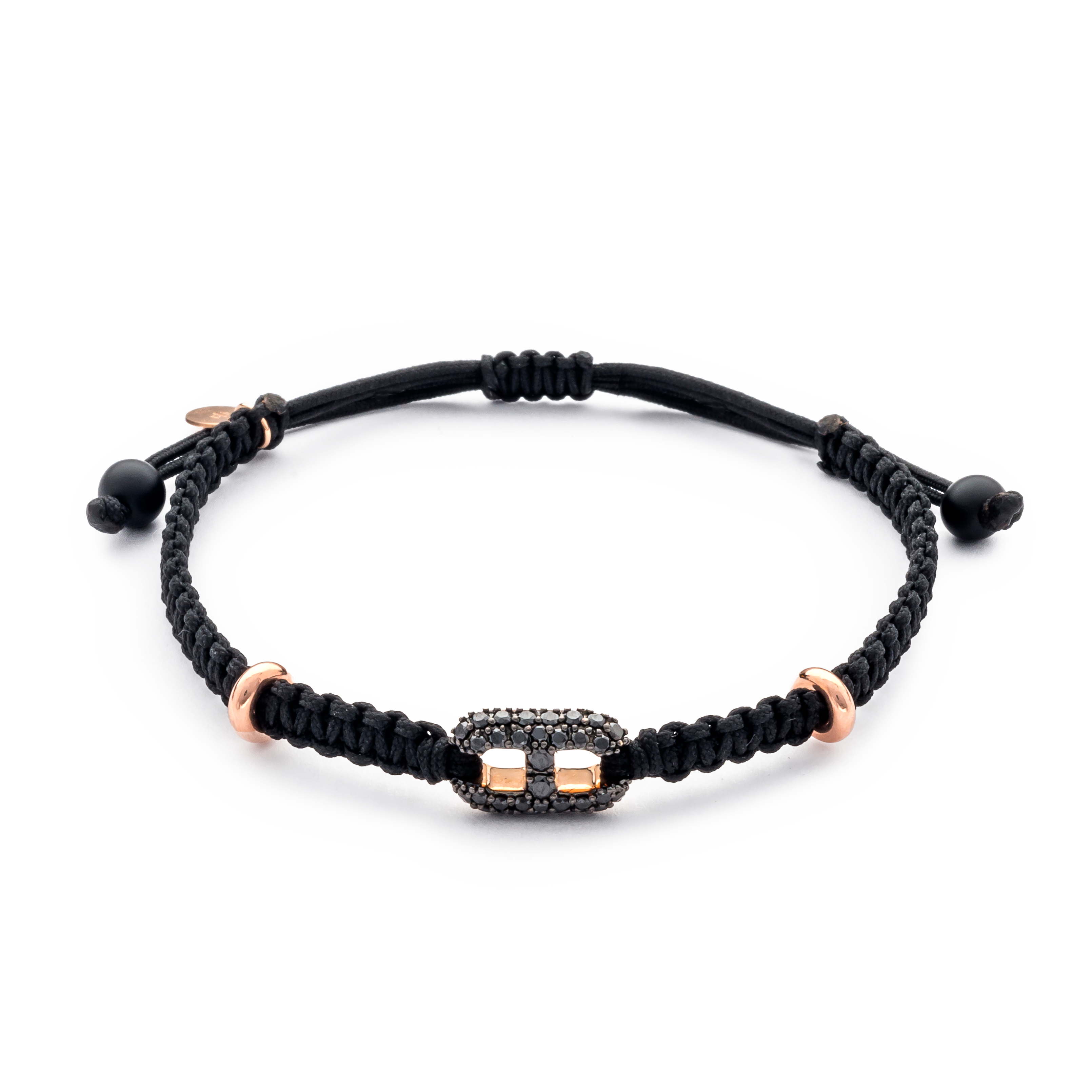 18K rose gold bracelet, onyx, 32 stones, large black diamond link, Adjustable nylon cord from 15cm to 25cm