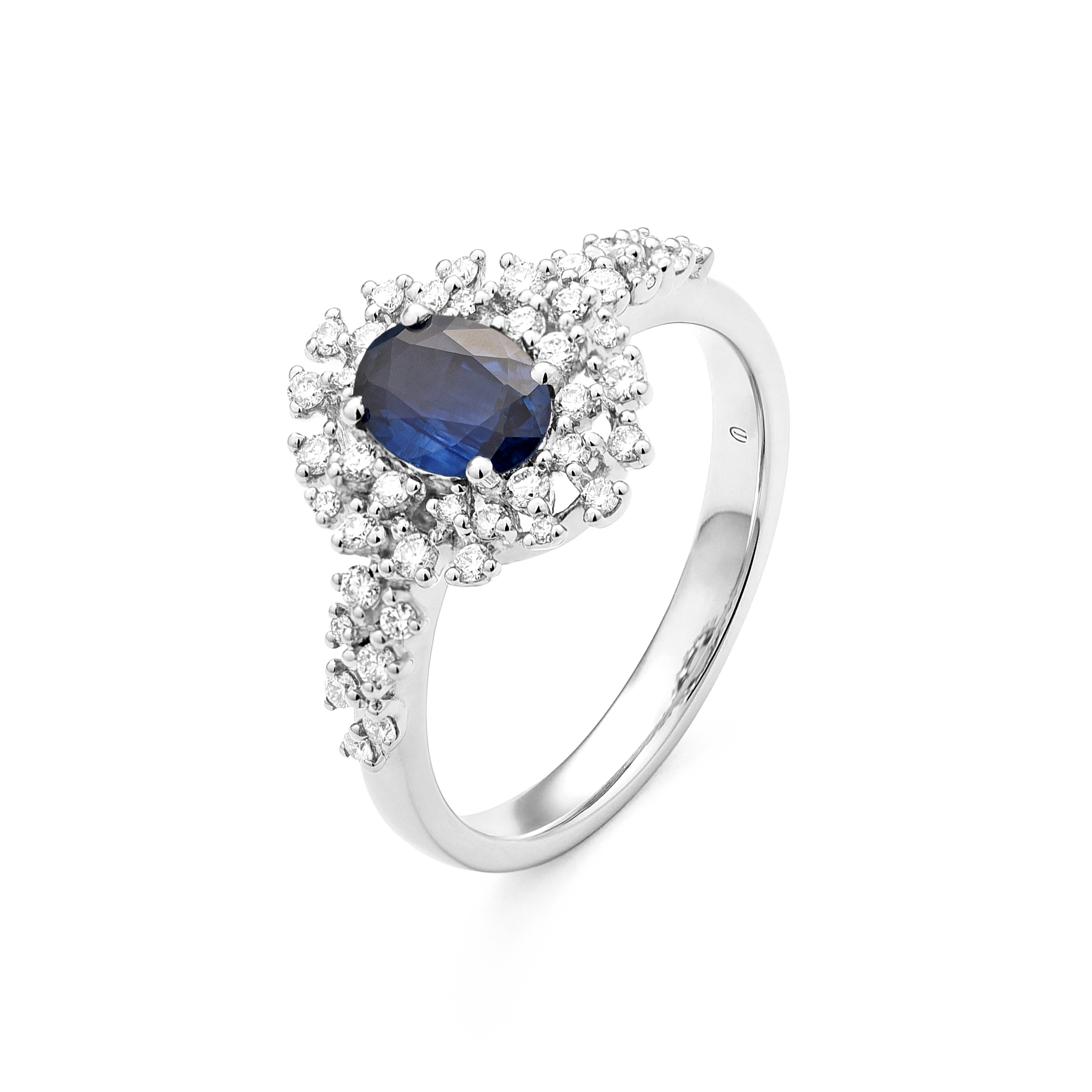 18K white gold ring, diamond color GH, clarity SI 0.35 ct, sapphire, 43 stones