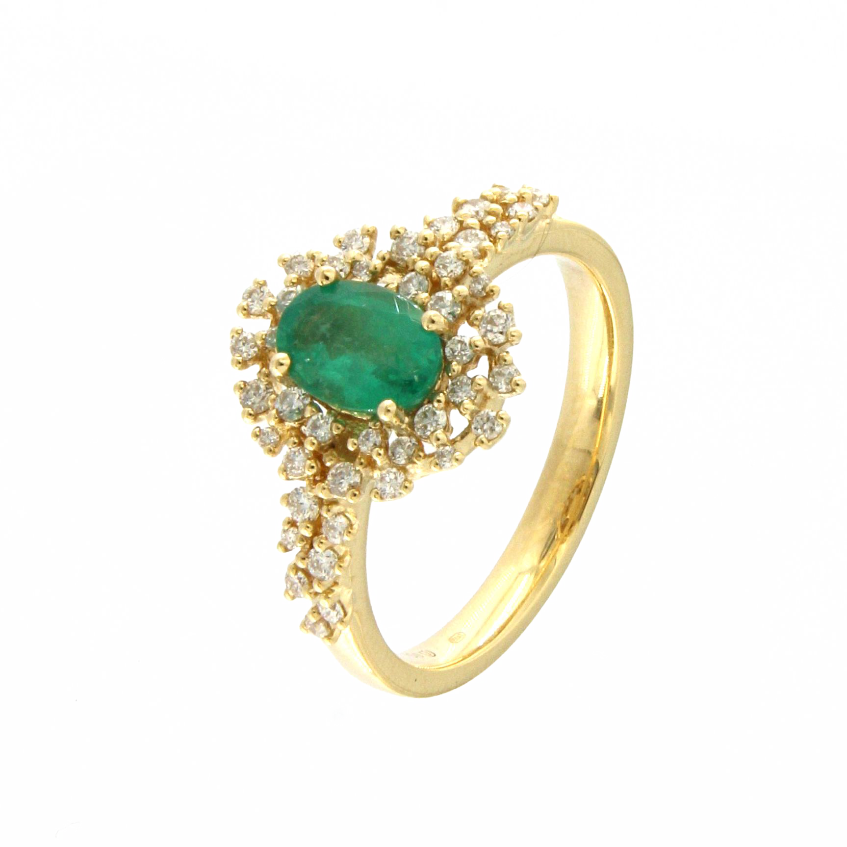18K yellow gold ring, diamond color GH, clarity SI 0.35 ct, emerald, 43 stones