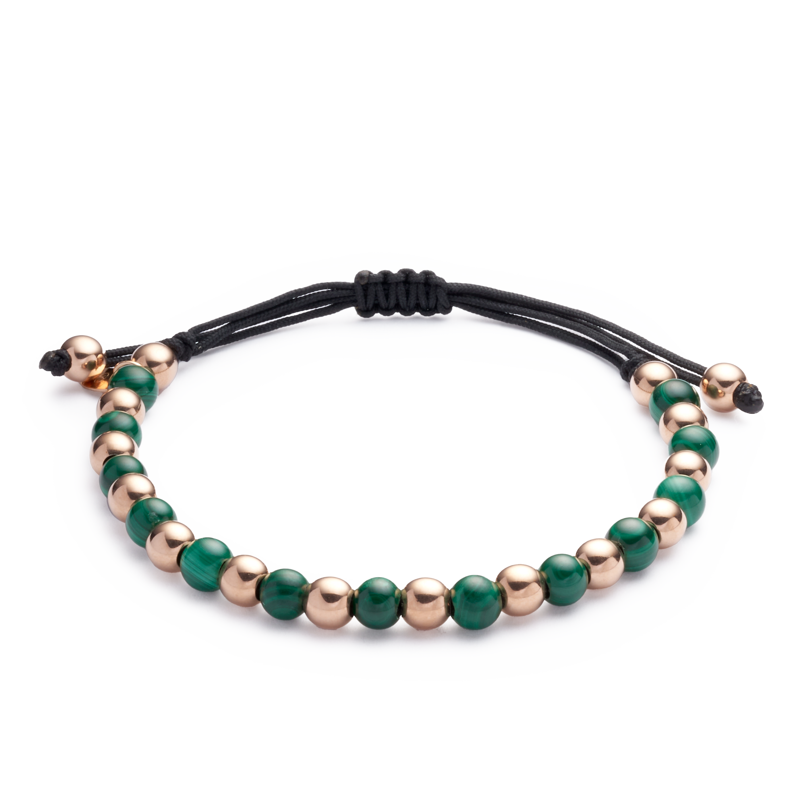 18K rose gold bracelet, malachite, 5mm bead, Adjustable nylon cord from 15cm to 25cm