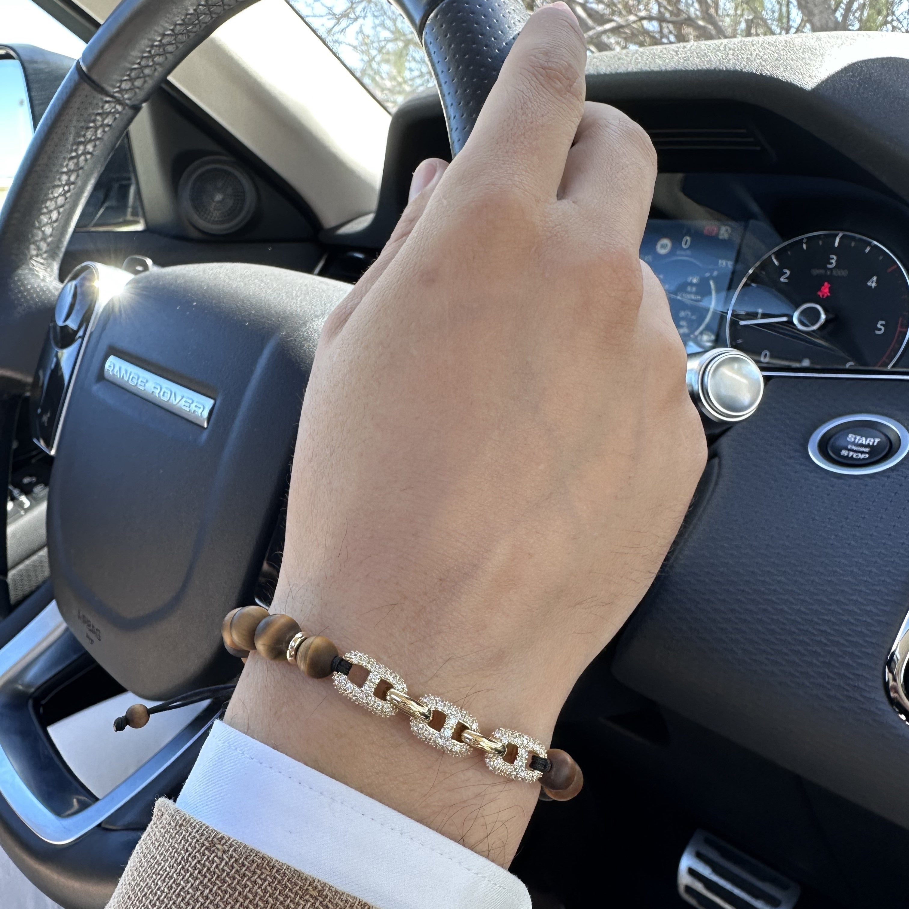 18K yellow gold bracelet, tiger eye, 96 stones, triple diamond link, Adjustable nylon cord from 15cm to 25cm