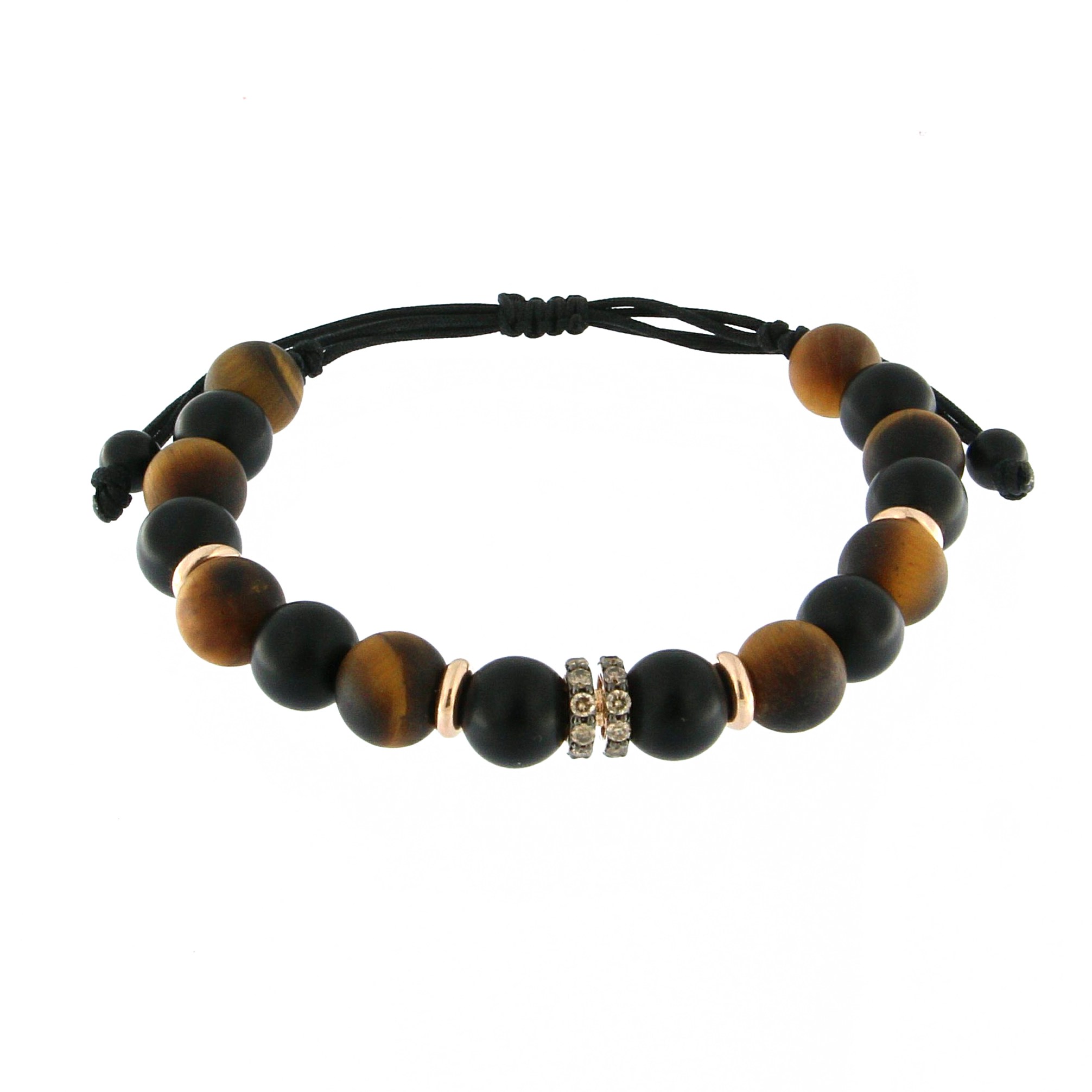 18K rose gold bracelet, tiger eye and onyx, 20 stones, double-wheel brown diamond, Adjustable nylon cord from 15cm to 25cm