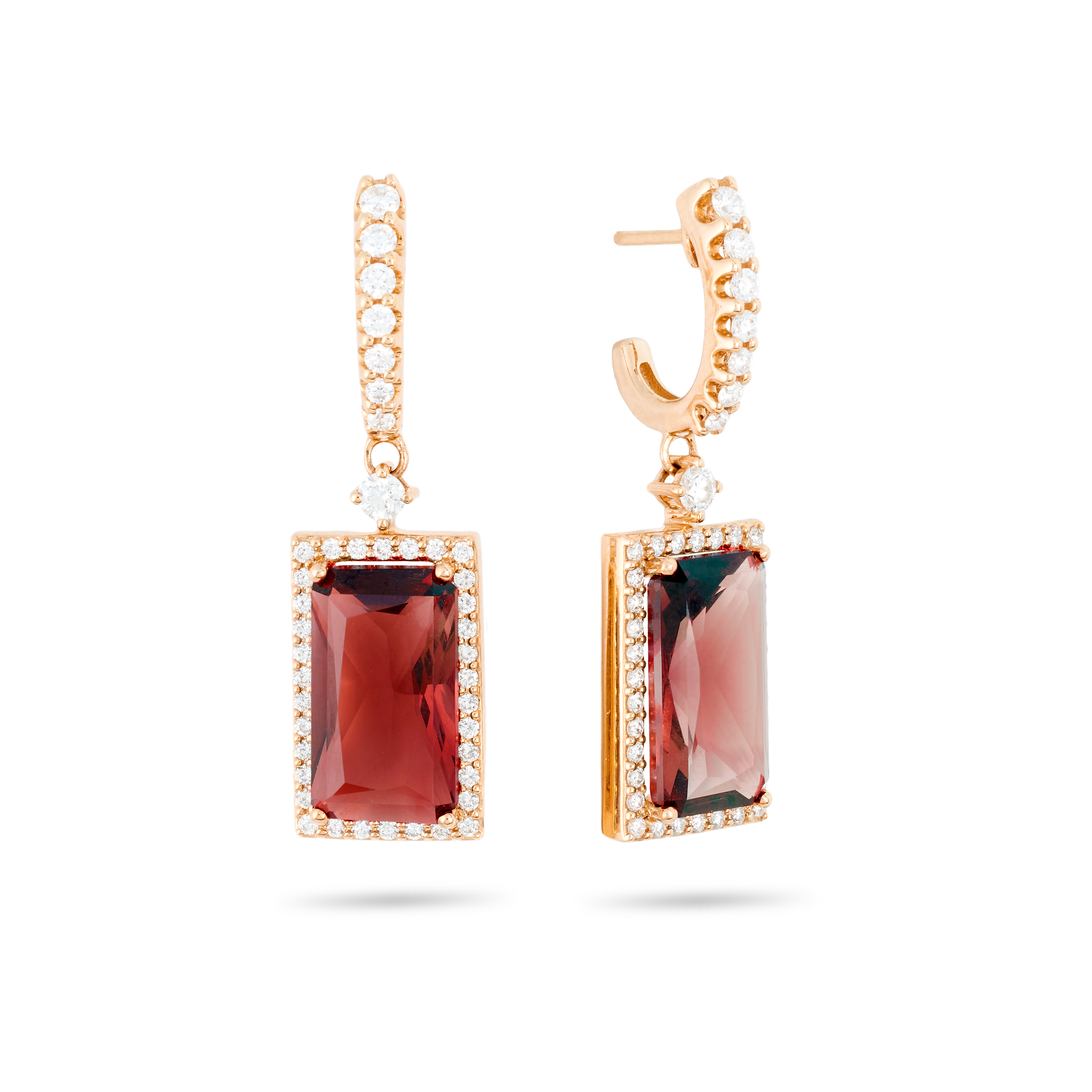 18K rose gold earring, diamond color GH, clarity SI 0.76 ct, garnet, 86 stones, pressure clasp