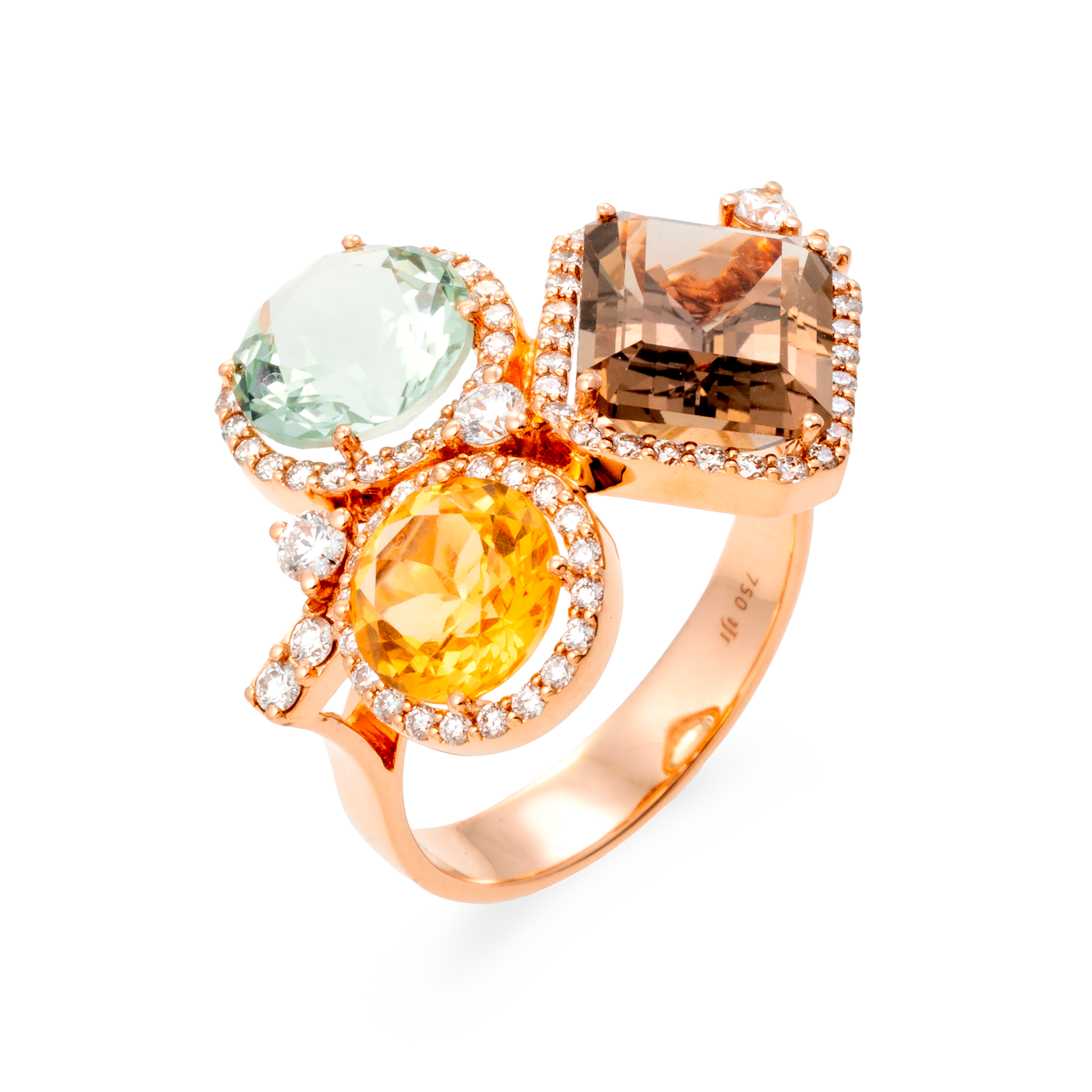 18K rose gold ring, diamond color GH, clarity SI 0.63 ct, prasiolite, fume quartz and citrine, 77 stones