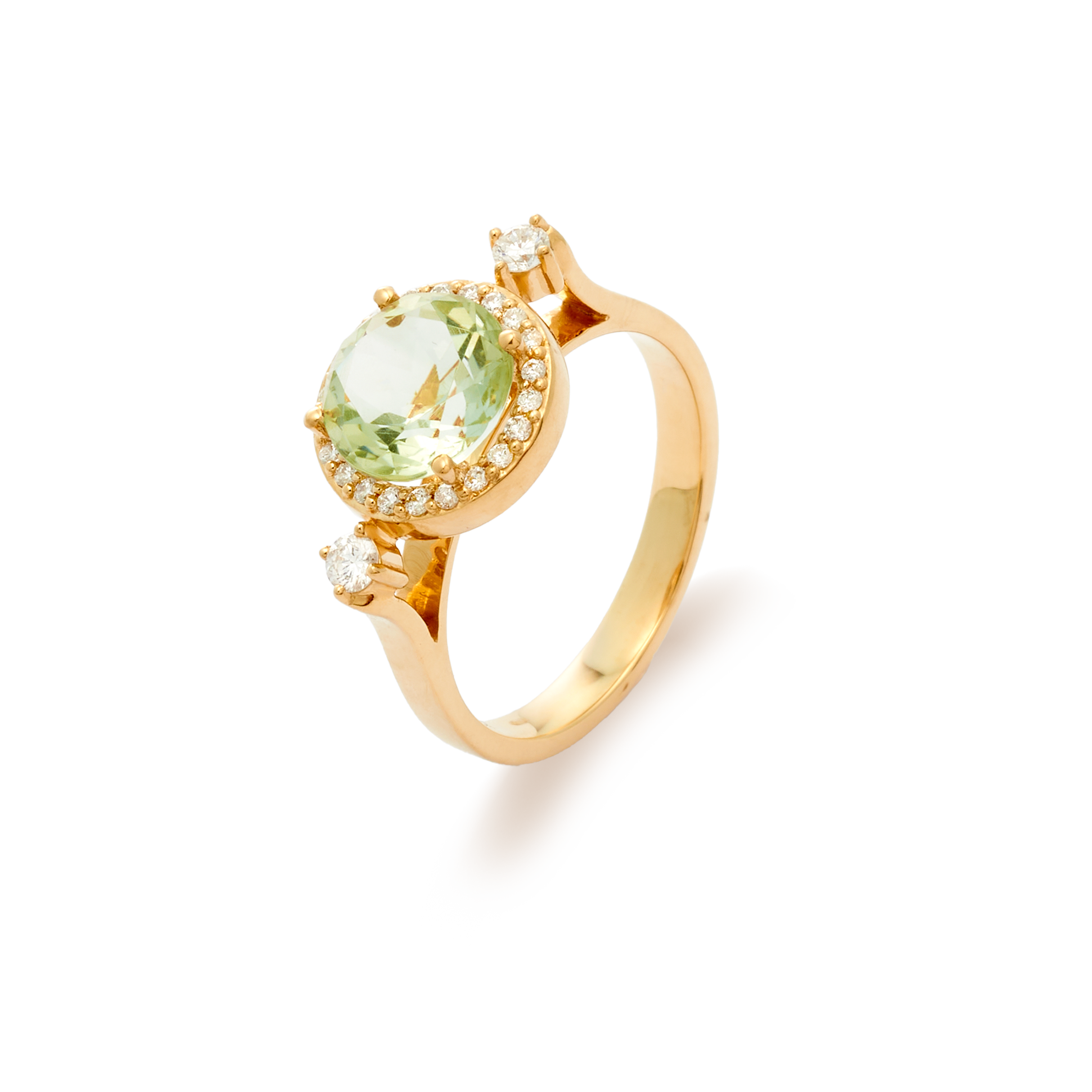 18K yellow gold ring, diamond color GH, clarity SI 0.22 ct, prasiolite, 24 stones