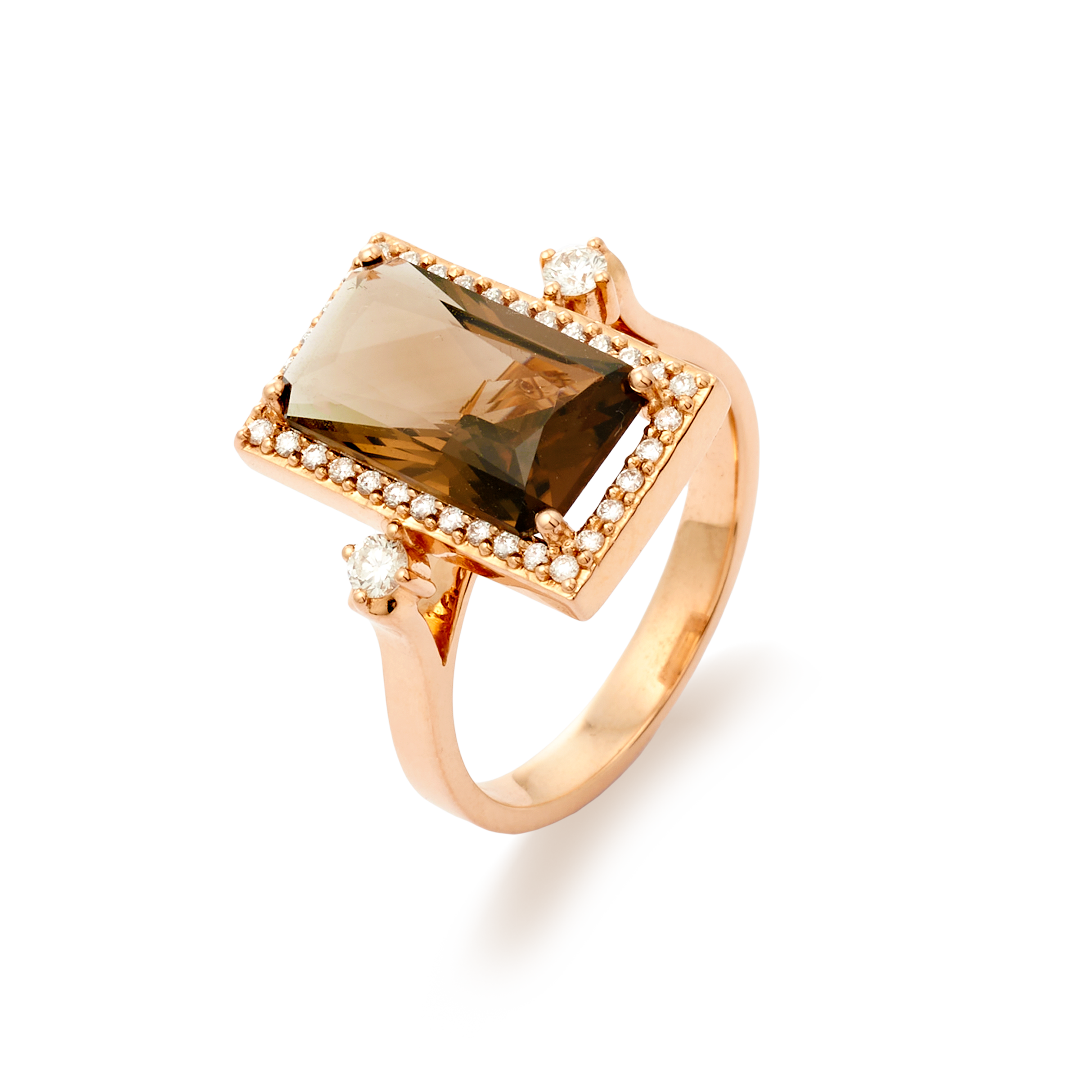 18K rose gold ring, diamond color GH, clarity SI 0.27 ct, fume quartz, 36 stones