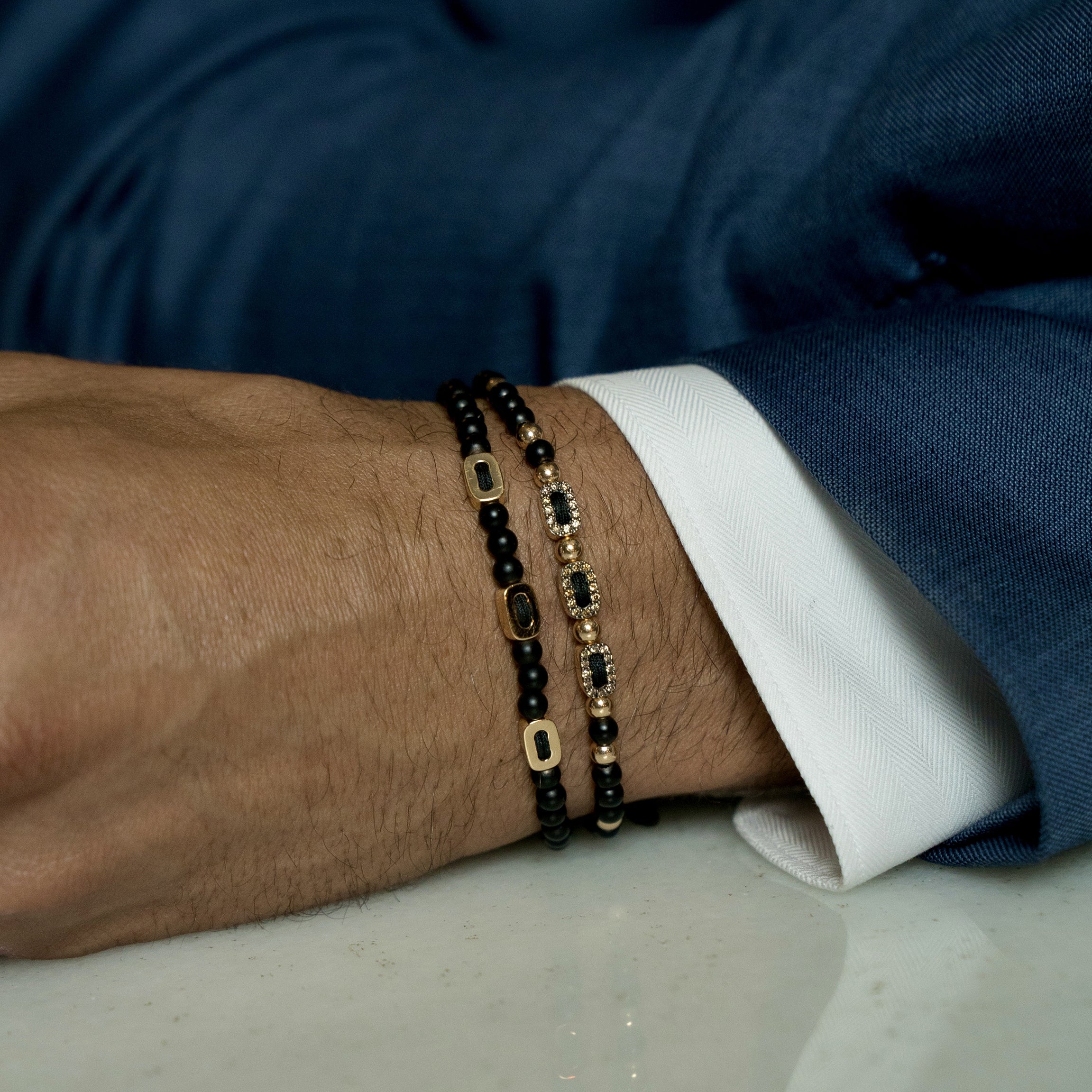 Bracelet or rose 18 carats, onyx, 36 pierres, maillon en diamant brun perle de 4 mm, Cordon nylon réglable de 15cm à 25cm