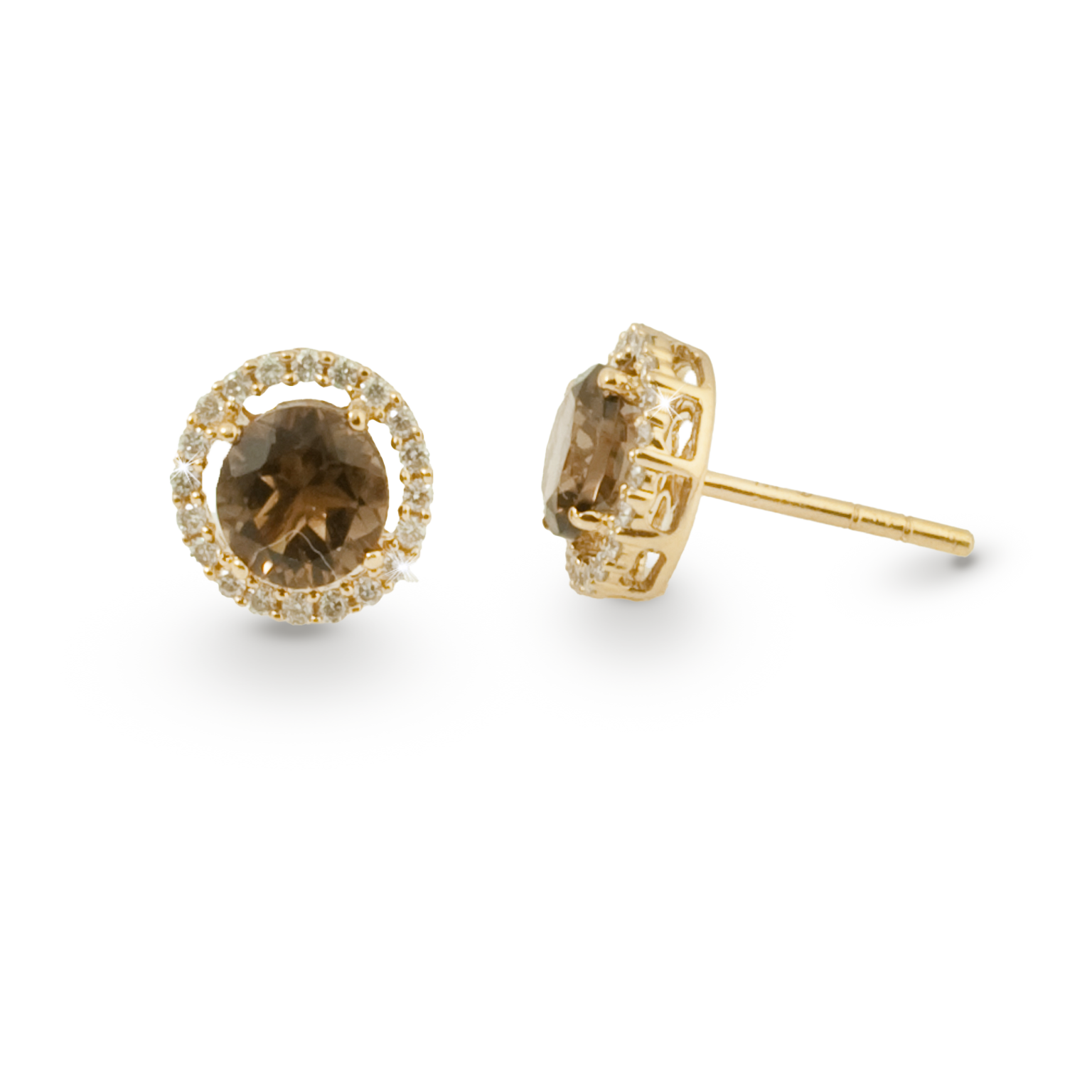 Boucles d´oreilles or jaune 18 carats, diamant couleur GH, pureté SI 0.25 ct, quartz de fumée, 40 pierres, fermoir à pression