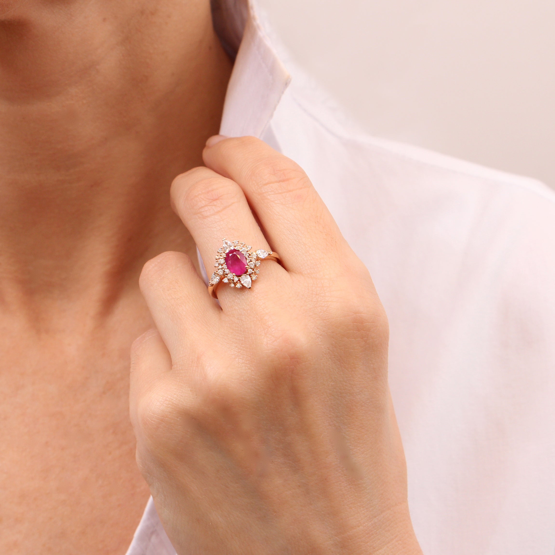 Bague or rose 18 carats, diamant couleur GH, pureté SI 0.22 ct et diamant 0.41 ct, rubis, 34 pierres