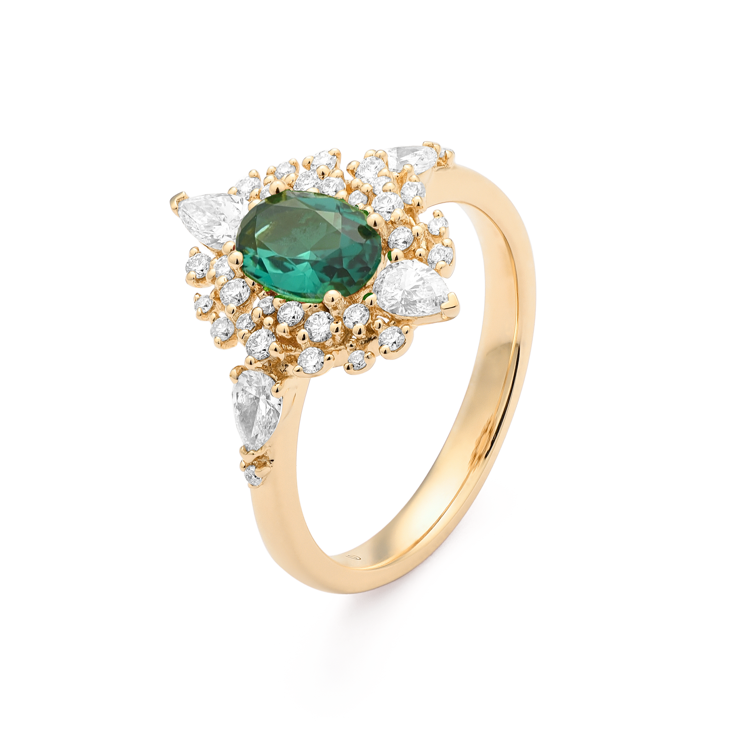 Bague or jaune 18 carats, diamant couleur GH, pureté SI 0.22 ct et diamant 0.42 ct, émeraude, 34 pierres