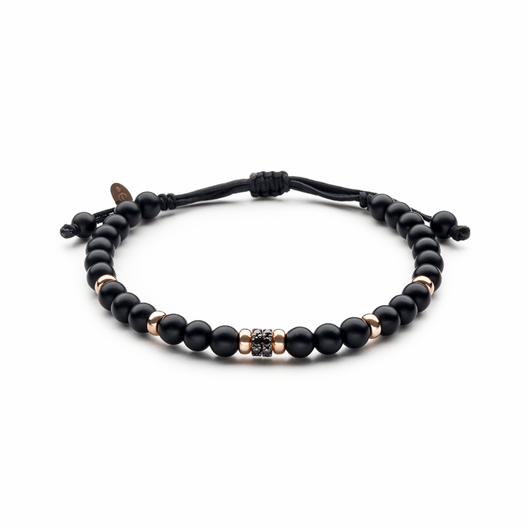 Bracelet or rose 18 carats, onyx, 14 pierres, roue en diamant noir, Cordon nylon réglable de 15cm à 25cm