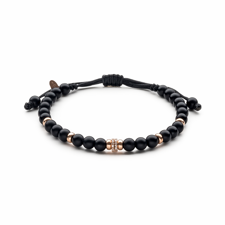 Bracelet or rose 18 carats, onyx, 28 pierres, roue en diamant de taille 8/8, Cordon nylon réglable de 15cm à 25cm