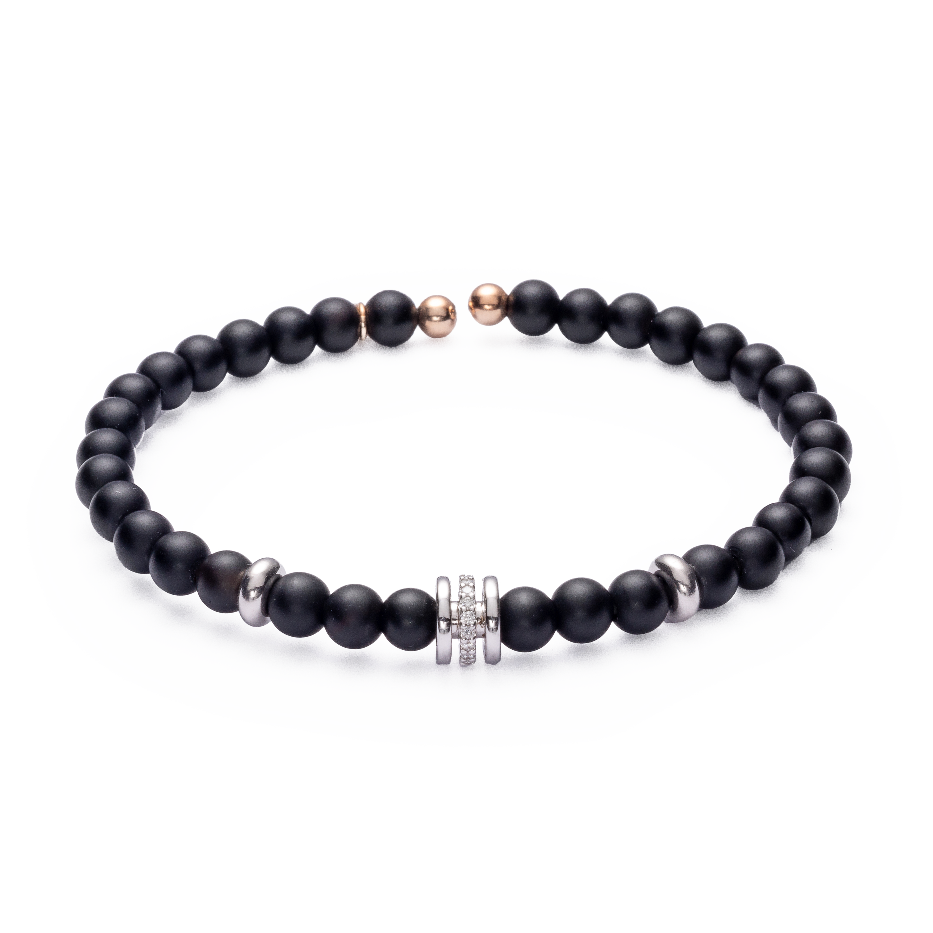 Bracelet or blanc 18 carats, onyx, 56 pierres, triple boucle en diamant perle de 4 mm titane taille S (6 x 5 cm)