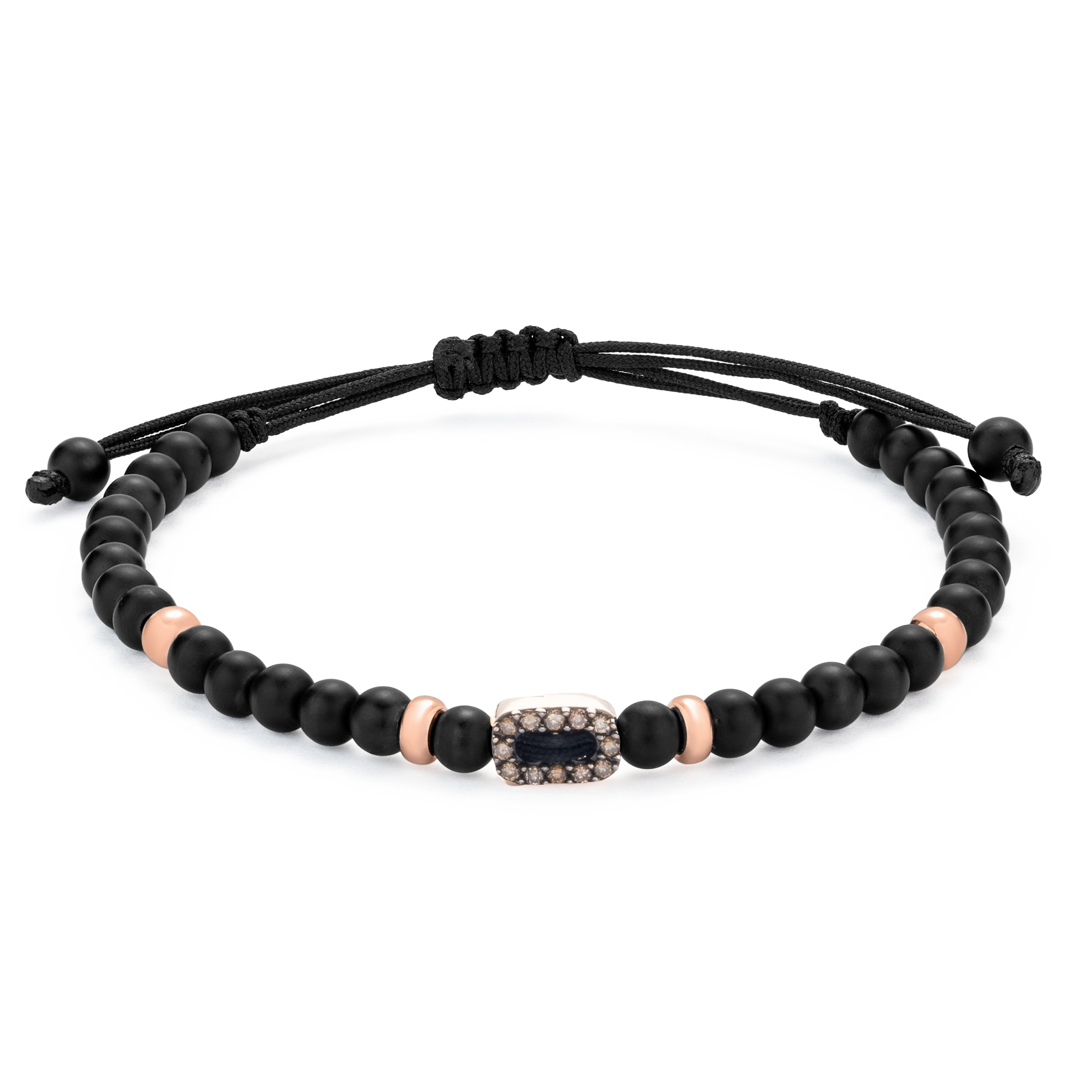 Bracelet or rose 18 carats, onyx, 12 pierres, maillon en diamant brun perle de 4 mm, Cordon nylon réglable de 15cm à 25cm