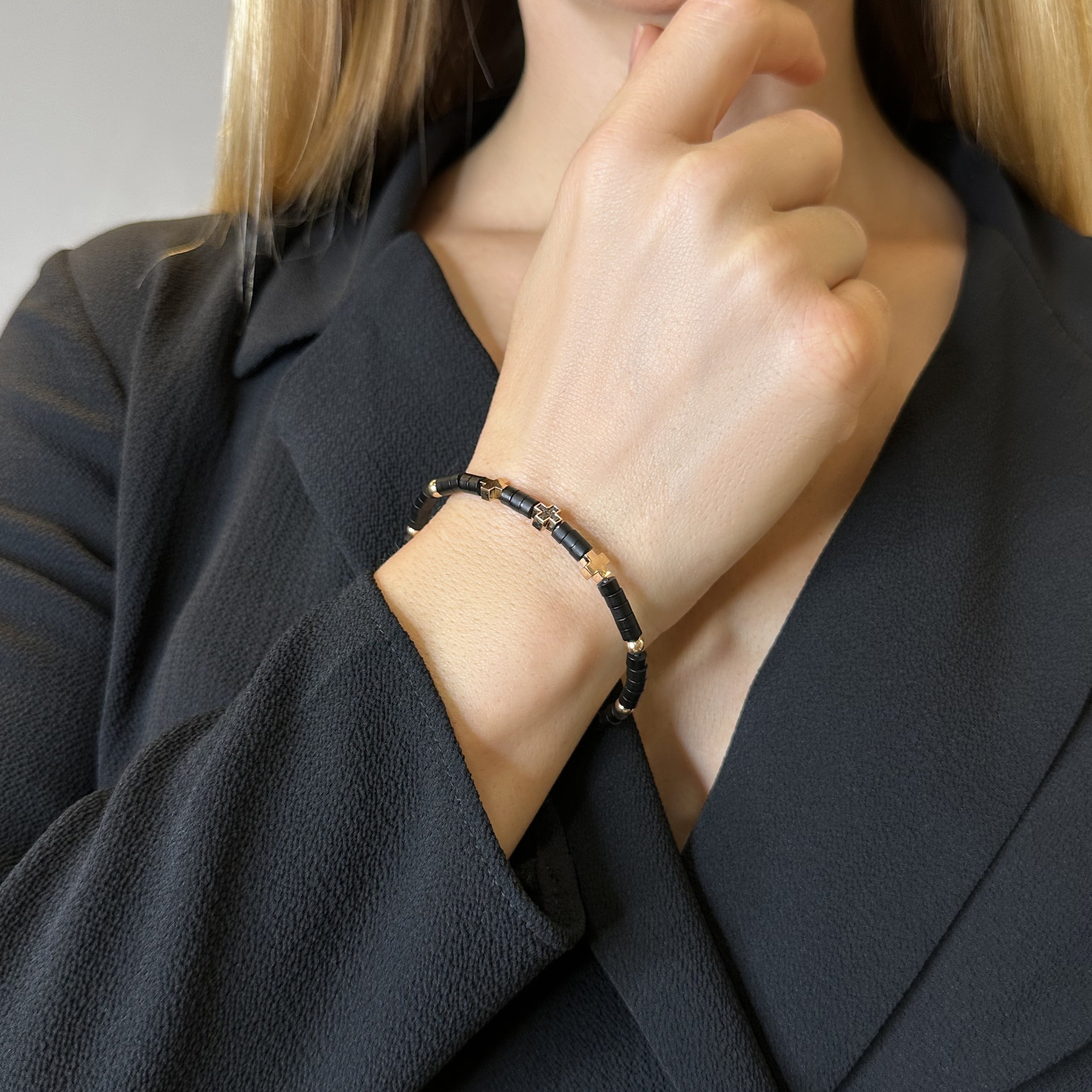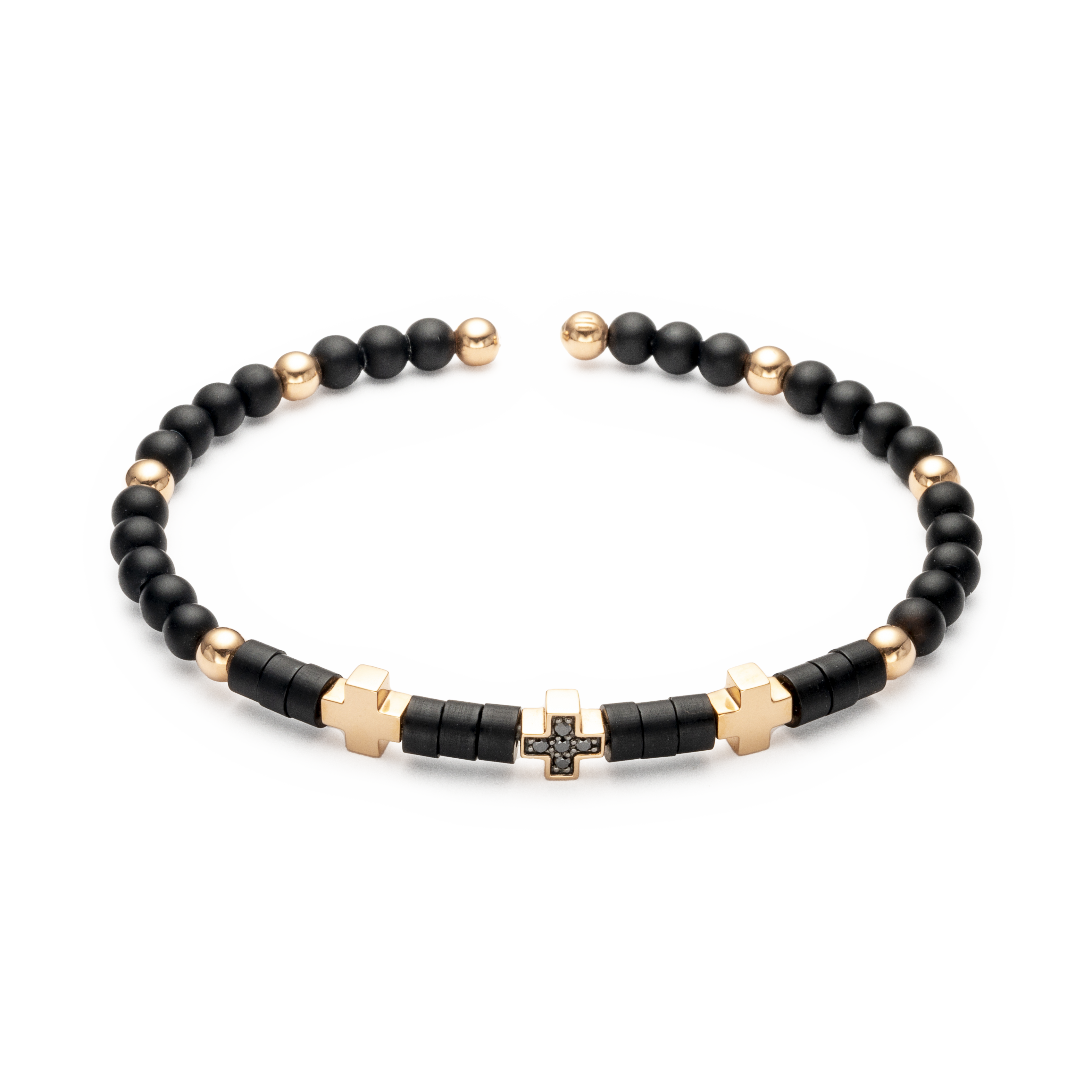 Bracelet or rose 18 carats, diamant noir 0.06 ct, onyx, 5 pierres, titane taille S (6 x 5 cm) perle de 4 mm