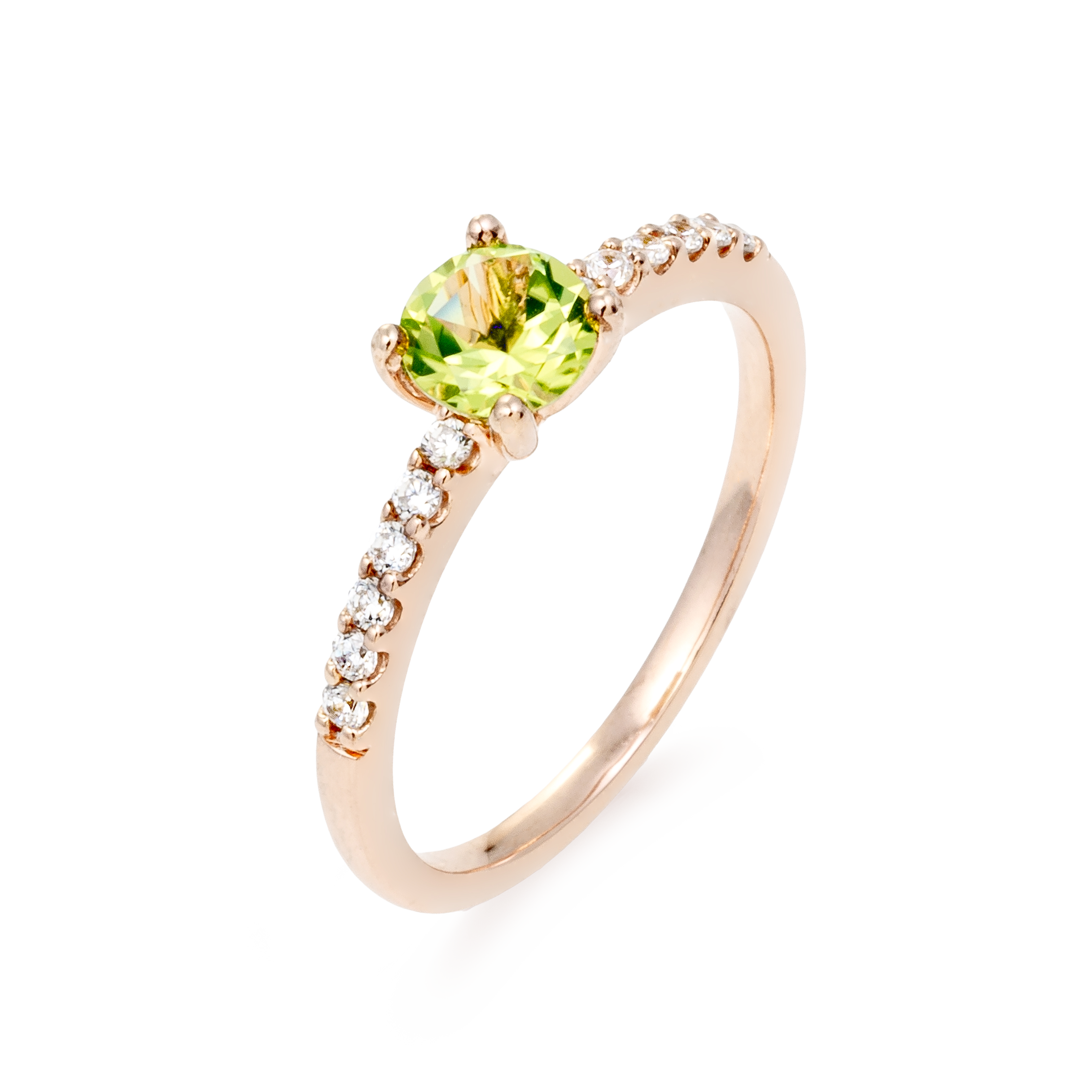 Bague or rose 18 carats, diamant couleur GH, pureté SI 0.14 ct, péridot, 12 pierres
