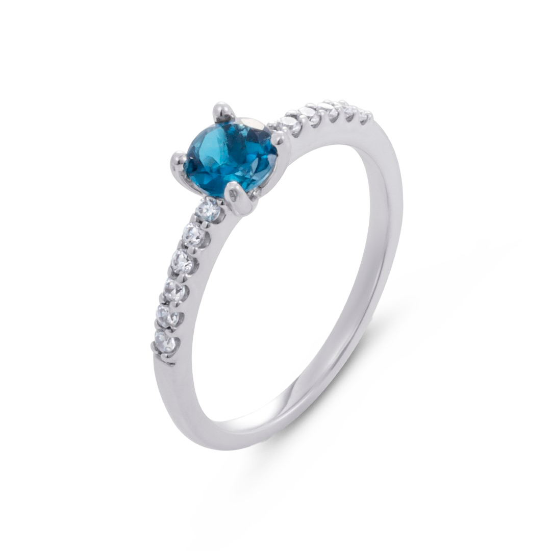 Bague or blanc 18 carats, diamant couleur GH, pureté SI 0.14 ct, london blue, 12 pierres