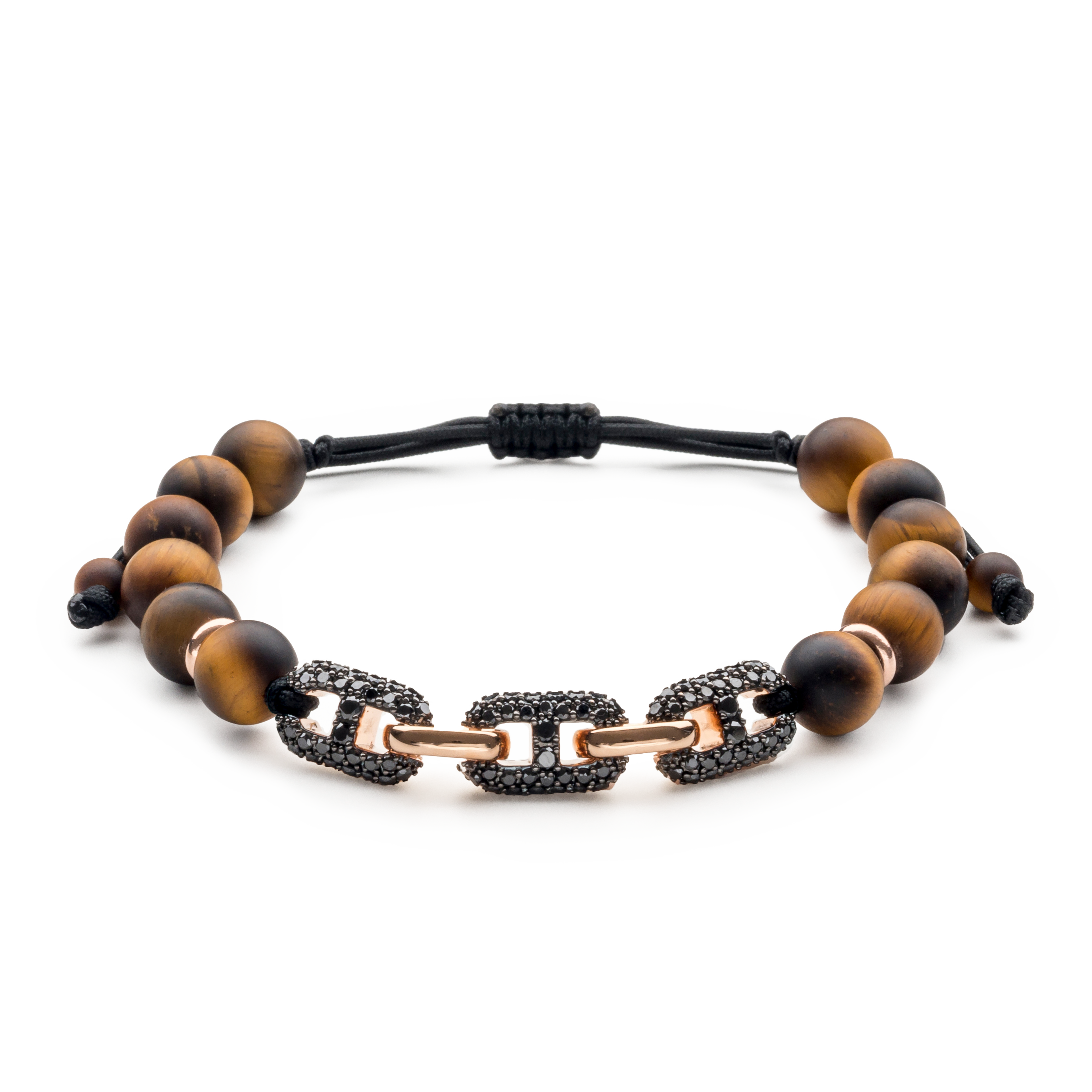 18K rose gold bracelet, tiger eye, 96 stones, triple black diamond link, Adjustable nylon cord from 15cm to 25cm