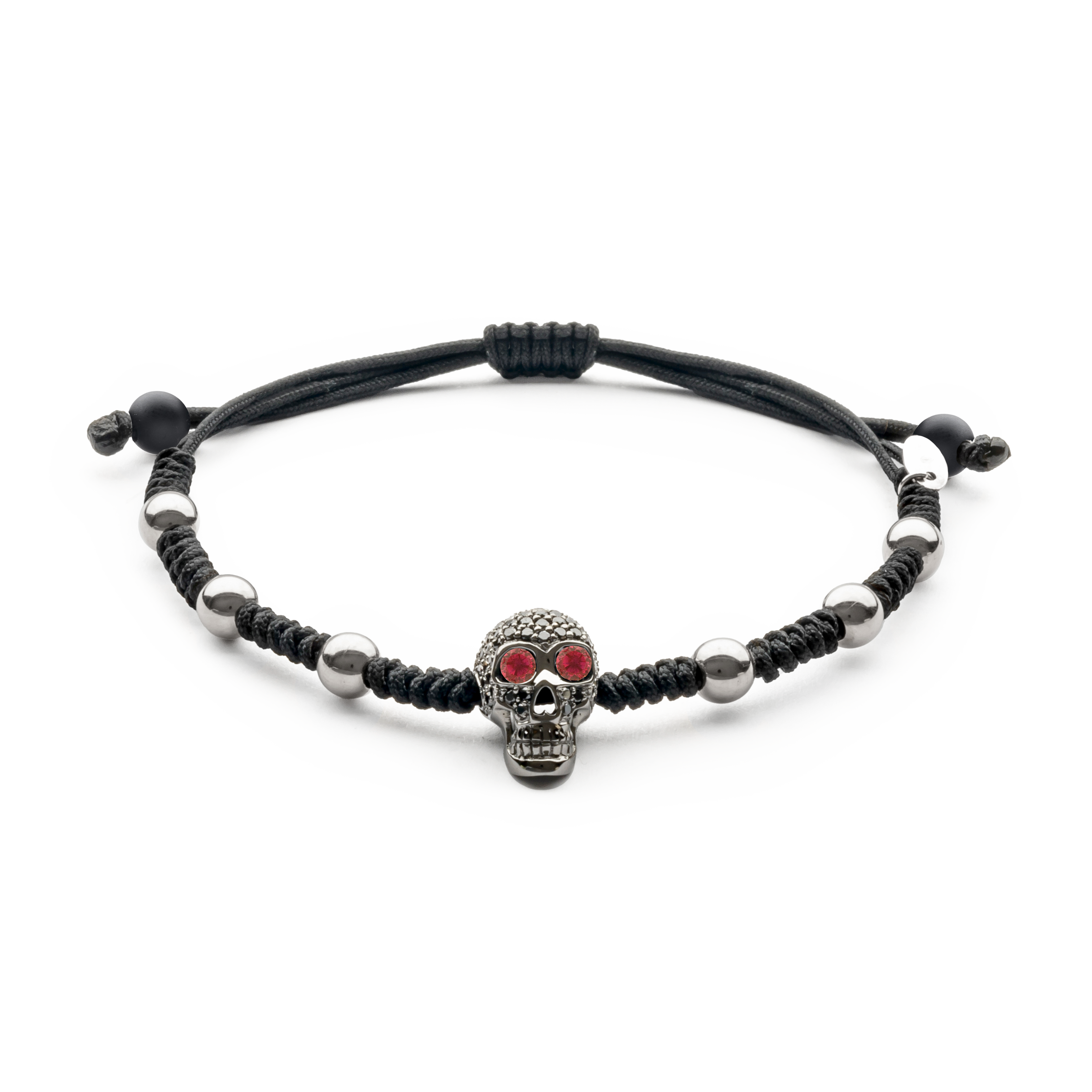 18K white gold bracelet, black diamond 0.71 ct, ruby, hematite and onyx, 109 stones, Adjustable nylon cord from 15cm to 25cm