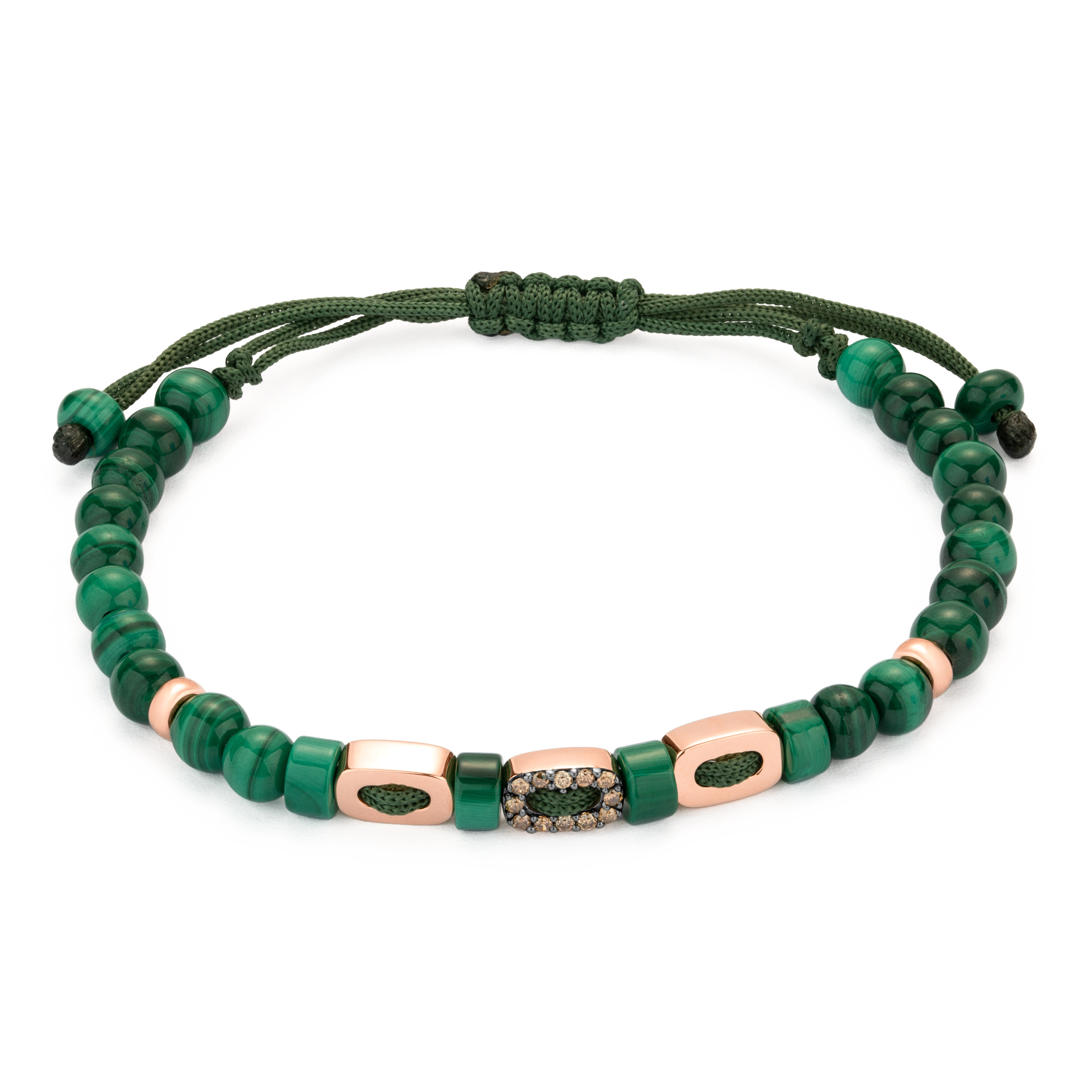 18K rose gold bracelet, malachite, 14 stones, brown diamond link smooth link, Adjustable nylon cord from 15cm to 25cm