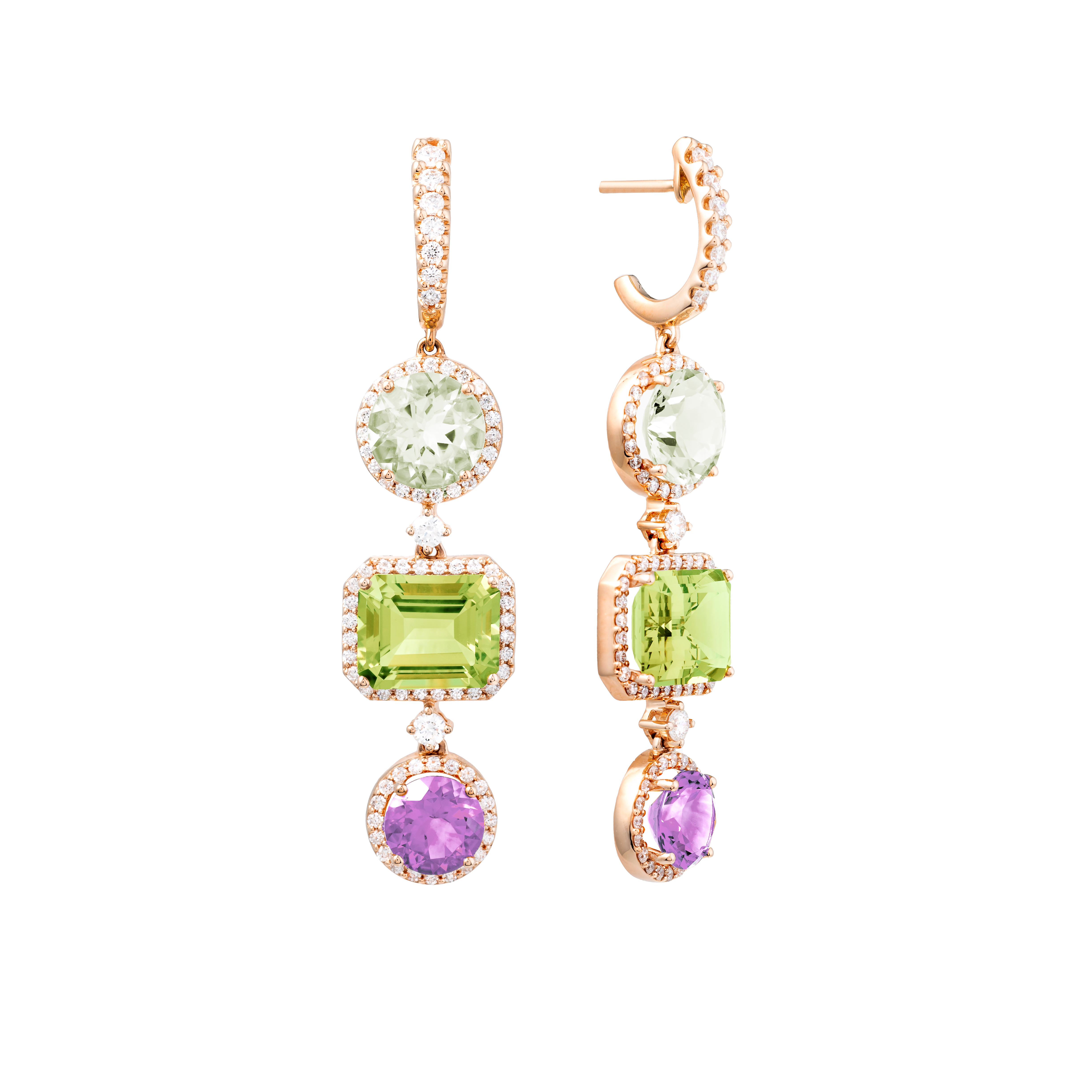 18K rose gold earring, diamond color GH, clarity SI 1.29 ct, prasiolite, peridot and amethyst, 160 stones, pressure clasp