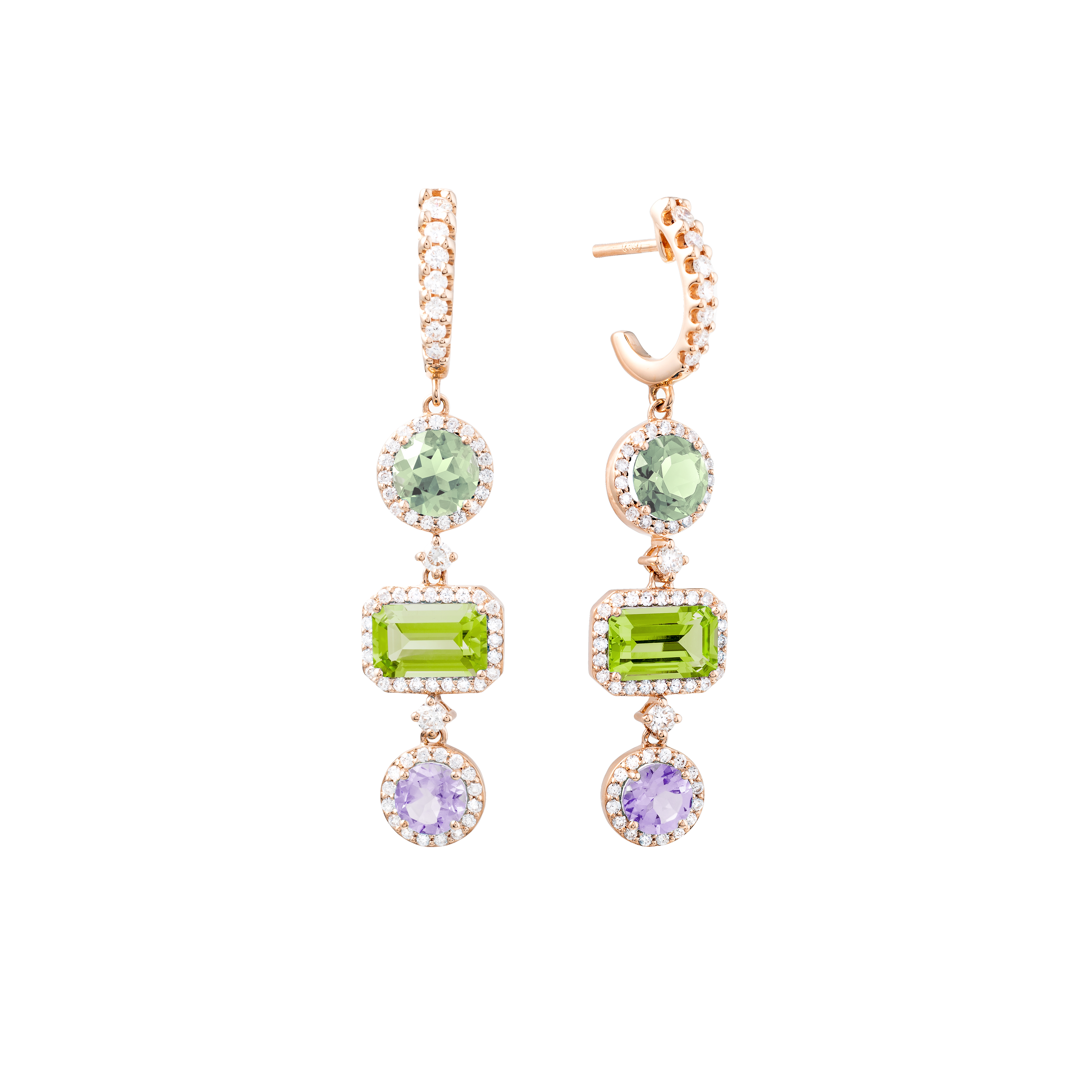 18K rose gold earring, diamond color GH, clarity SI 1.03 ct, peridot, amethyst and prasiolite, 136 stones, pressure clasp