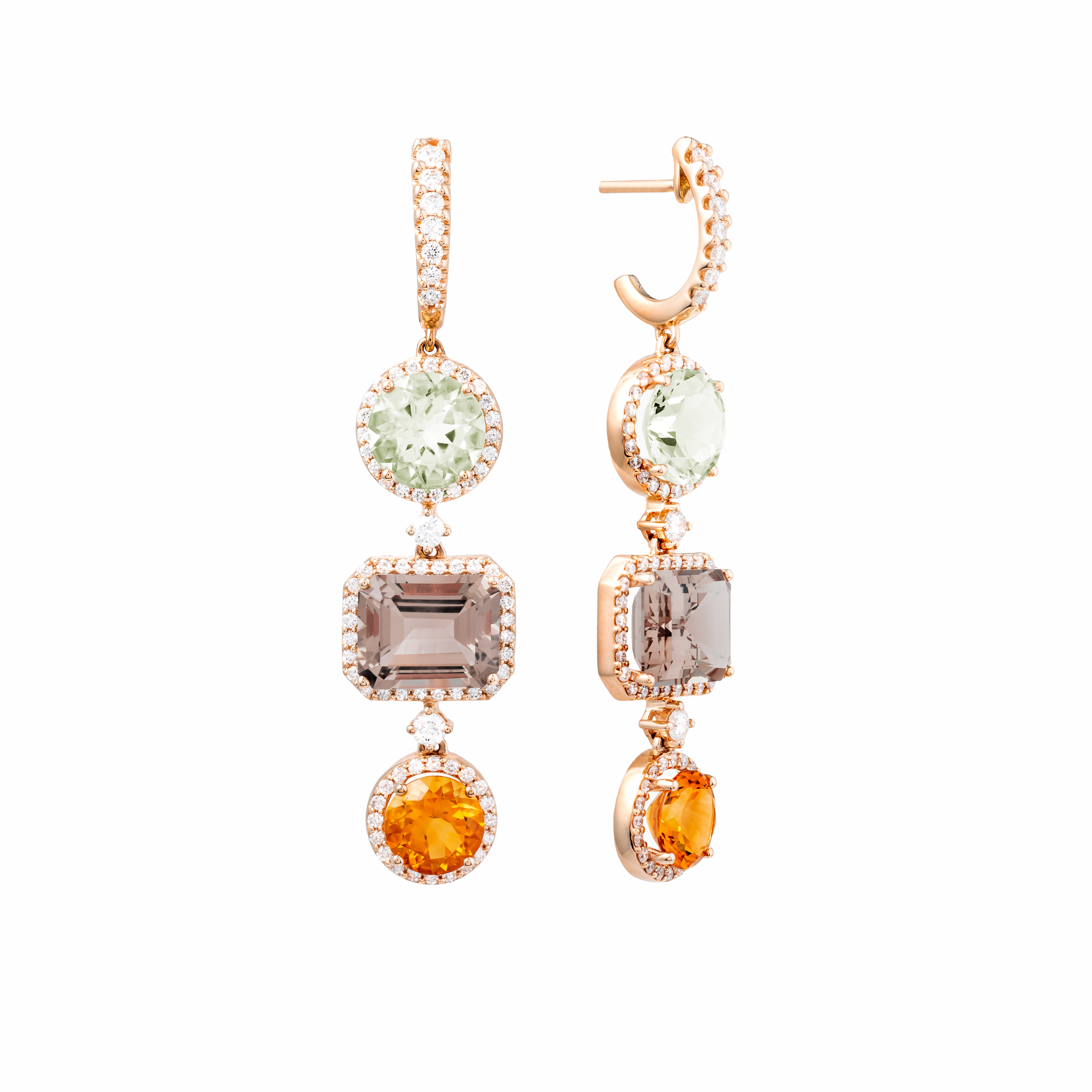 18K rose gold earring, diamond color GH, clarity SI 1.03 ct, fume quartz, citrine and prasiolite, 136 stones, pressure clasp