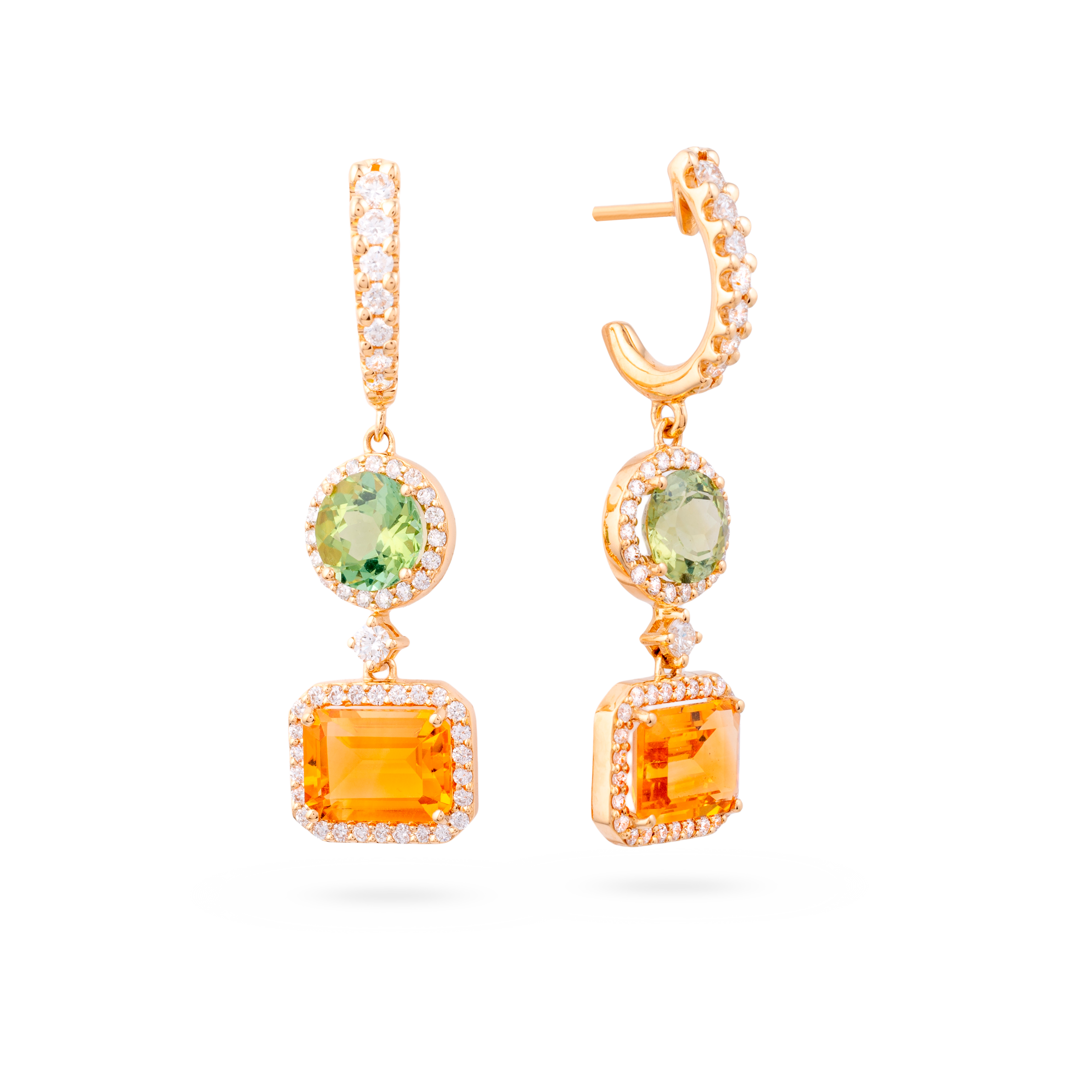 18K rose gold earring, diamond color GH, clarity SI 0.81 ct, citrine, 106 stones, pressure clasp