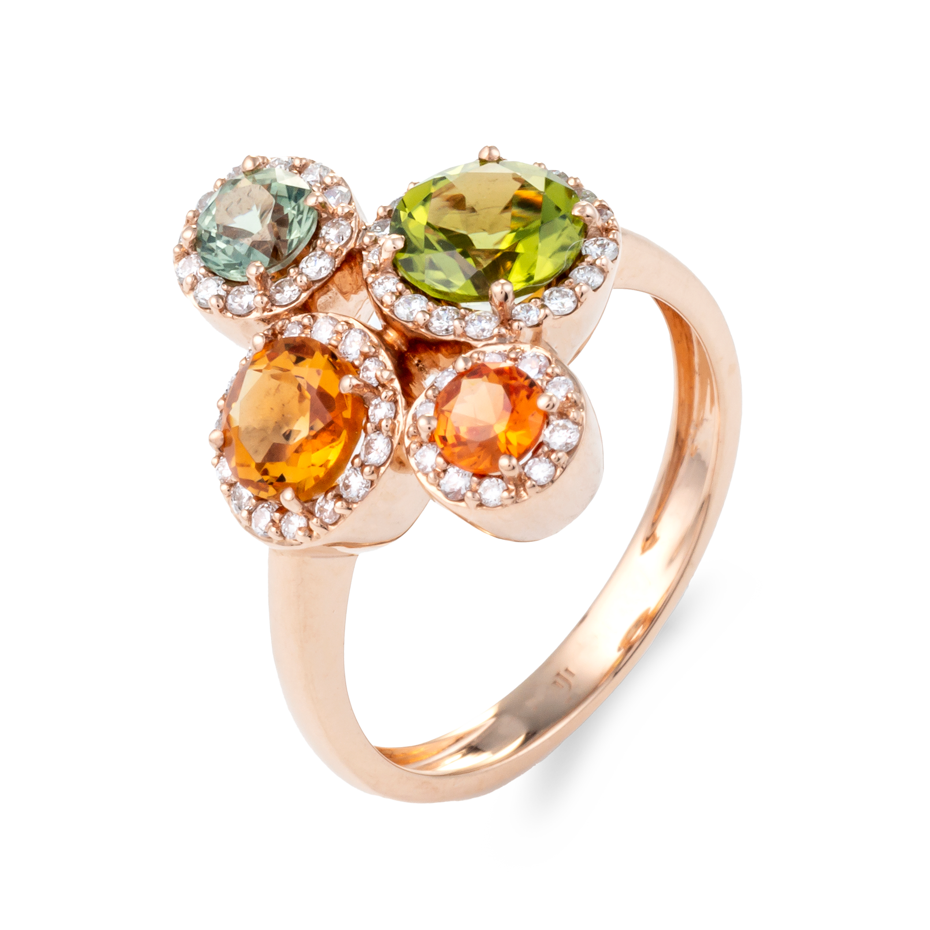 18K rose gold ring, diamond color GH, clarity SI 0.31 ct, sapphire, peridot and citrine, 54 stones
