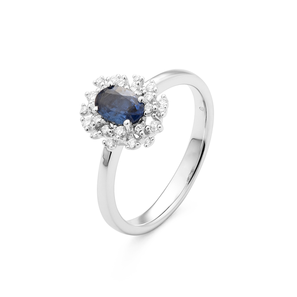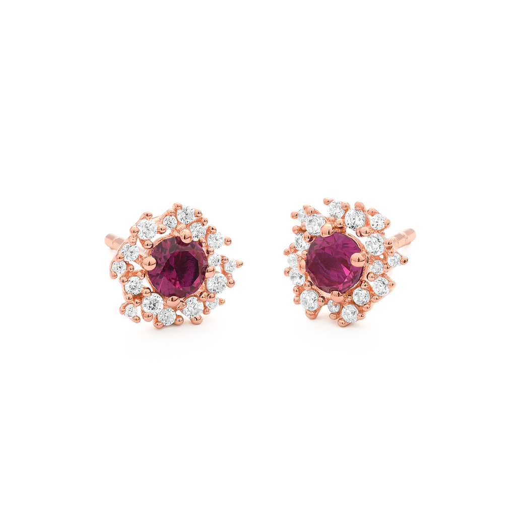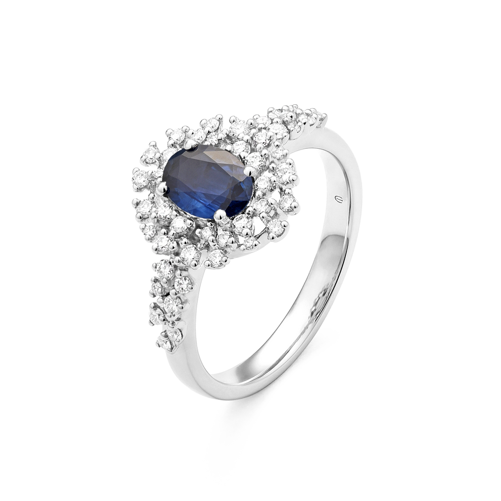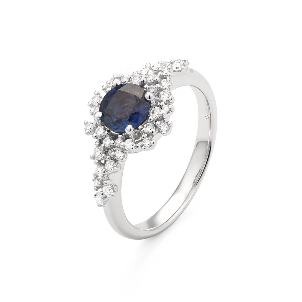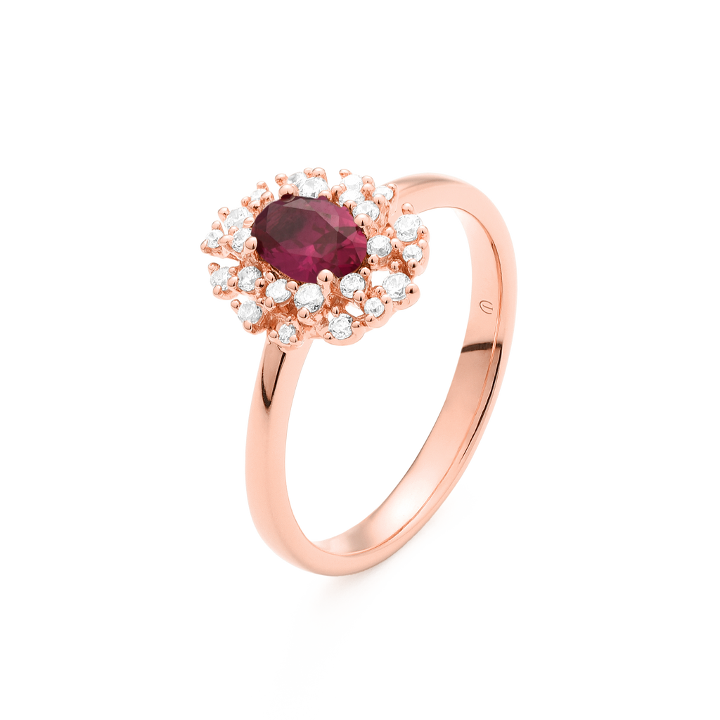 Armonia tra tradizione e modernità: gli aloni classici incontrano l'eleganza contemporanea con diamanti disposti artisticamente attorno a vivaci gemme centrali.