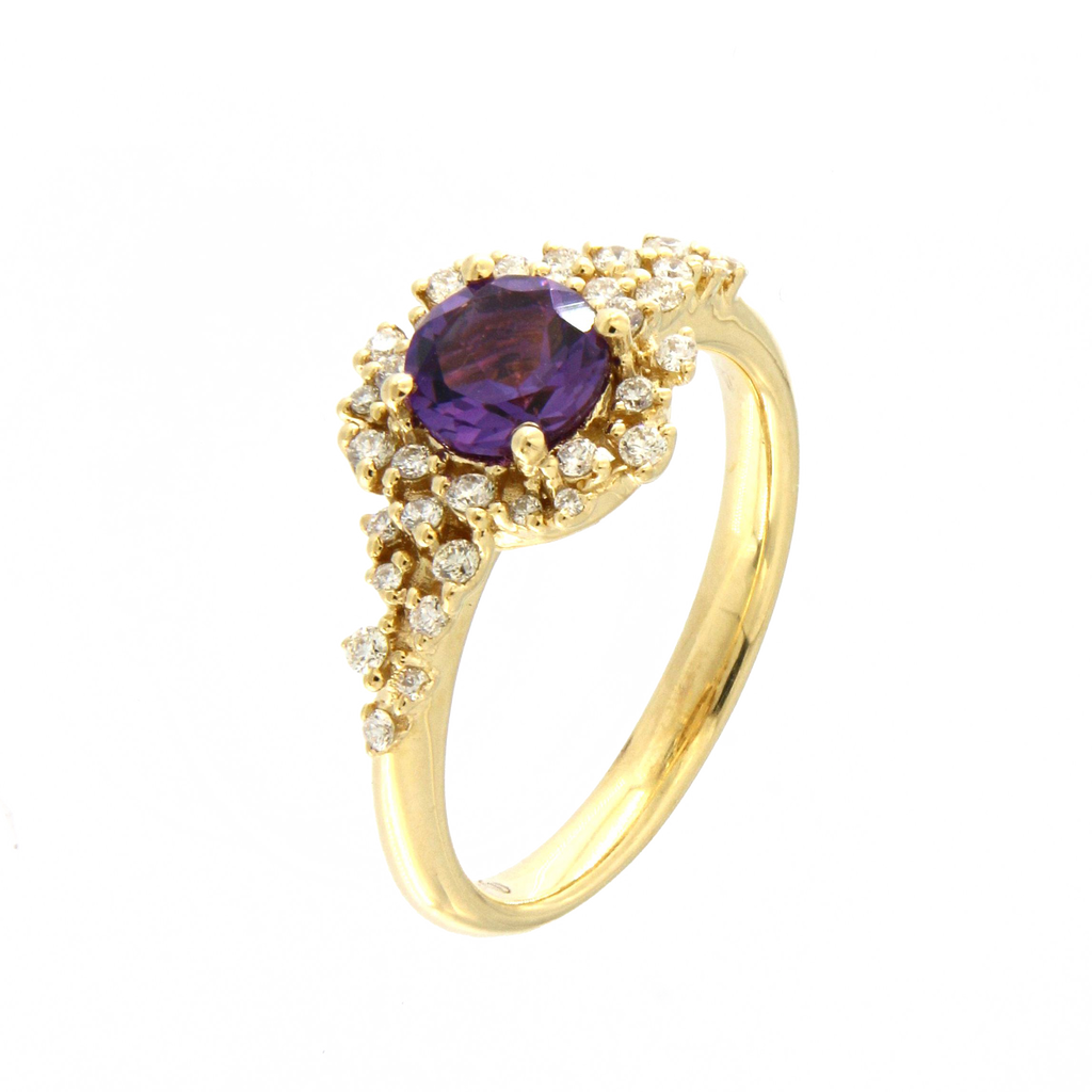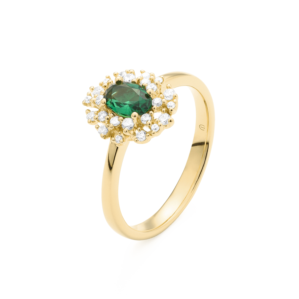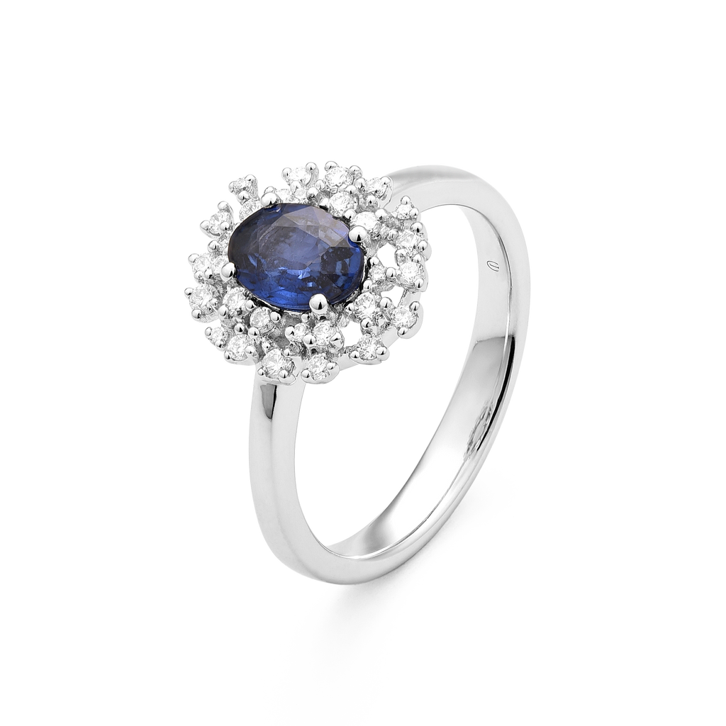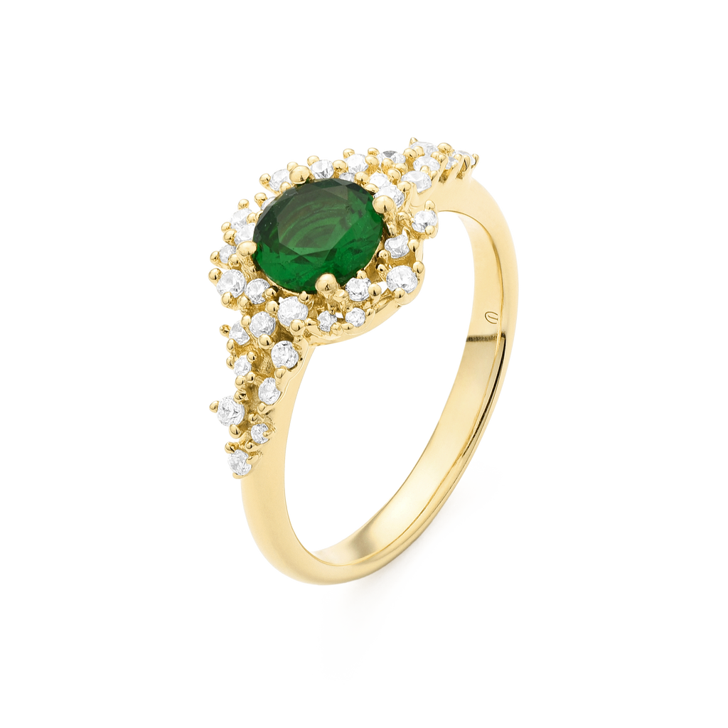 Armonia tra tradizione e modernità: gli aloni classici incontrano l'eleganza contemporanea con diamanti disposti artisticamente attorno a vivaci gemme centrali.