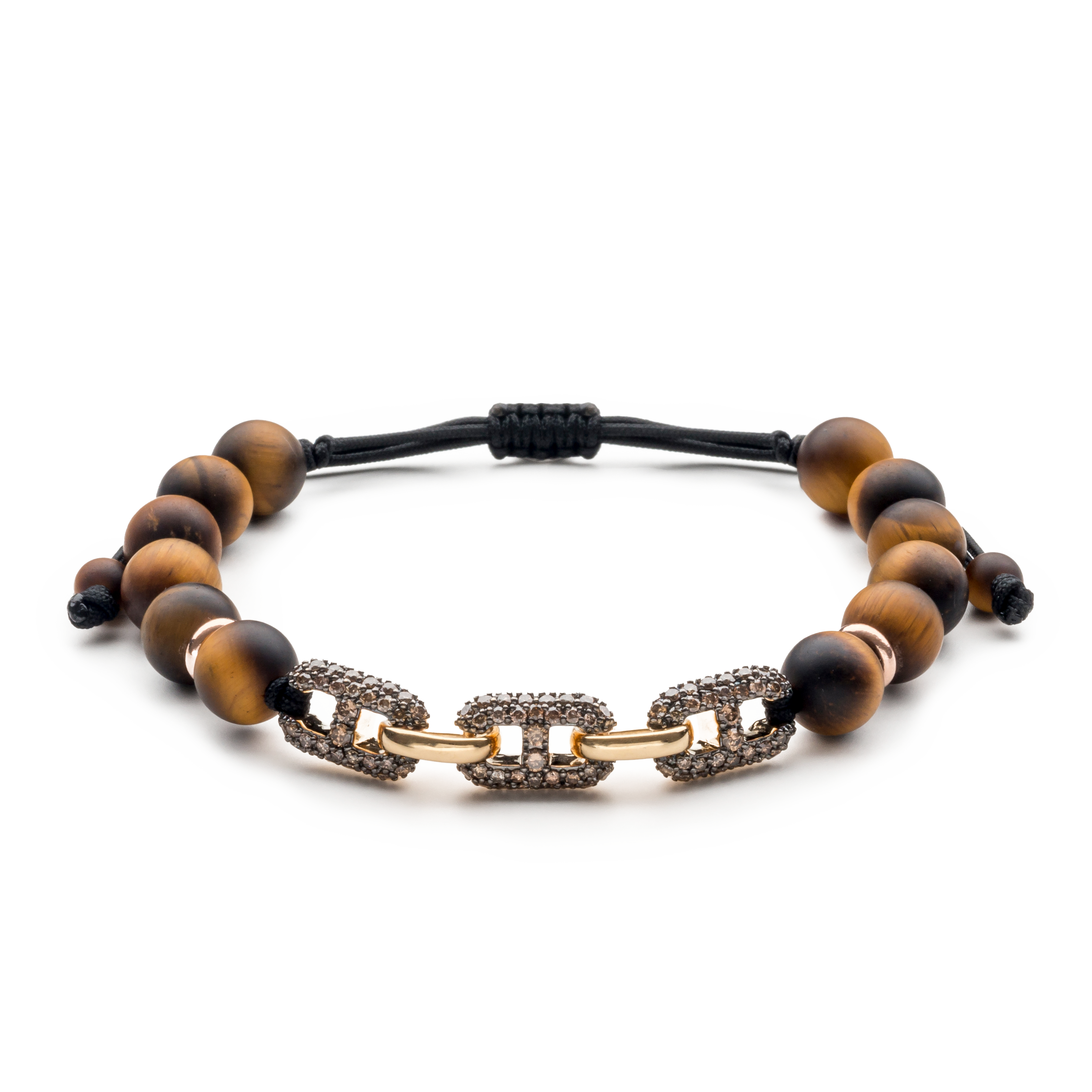 18K yellow gold bracelet, tiger eye, 96 stones, triple brown diamond link, Adjustable nylon cord from 15cm to 25cm