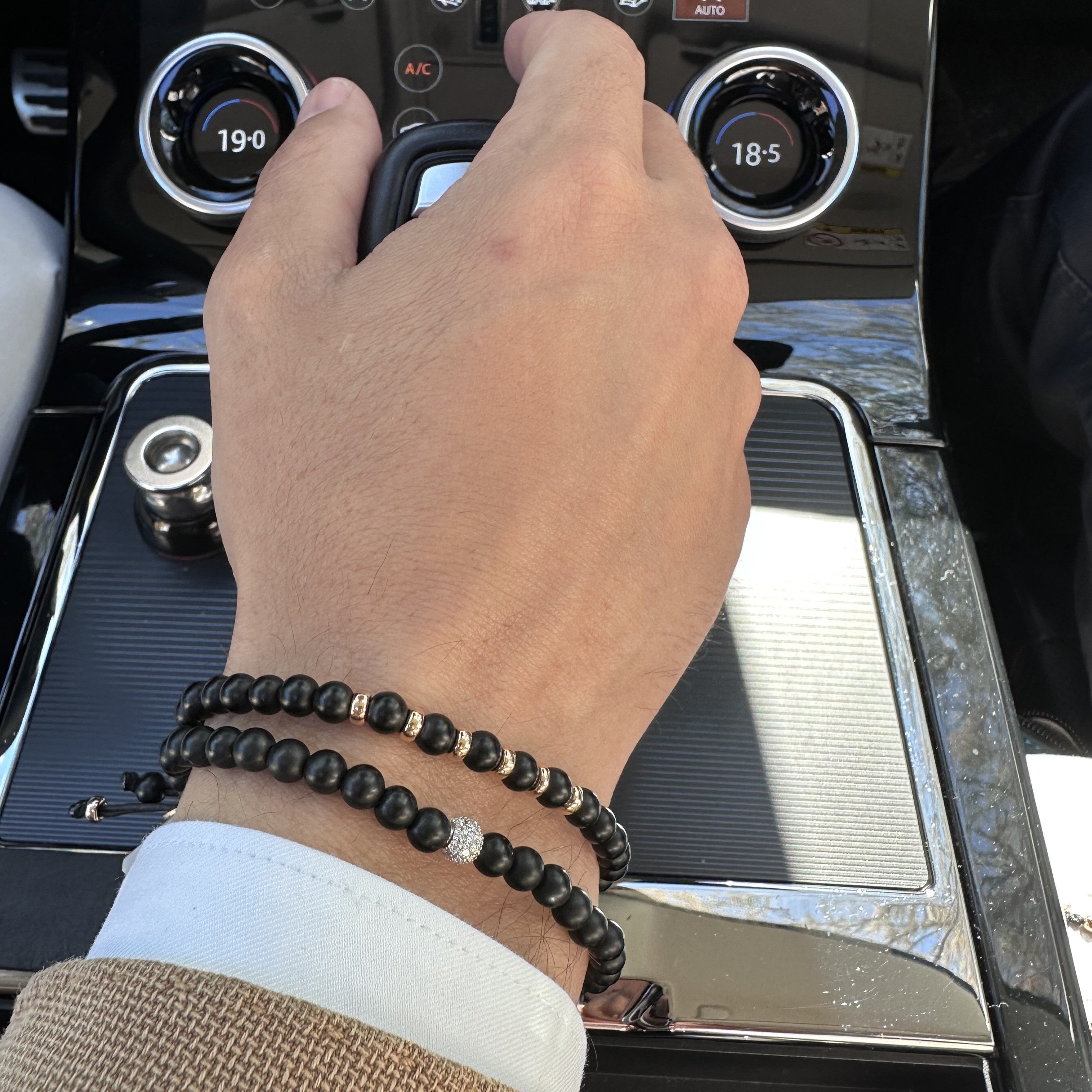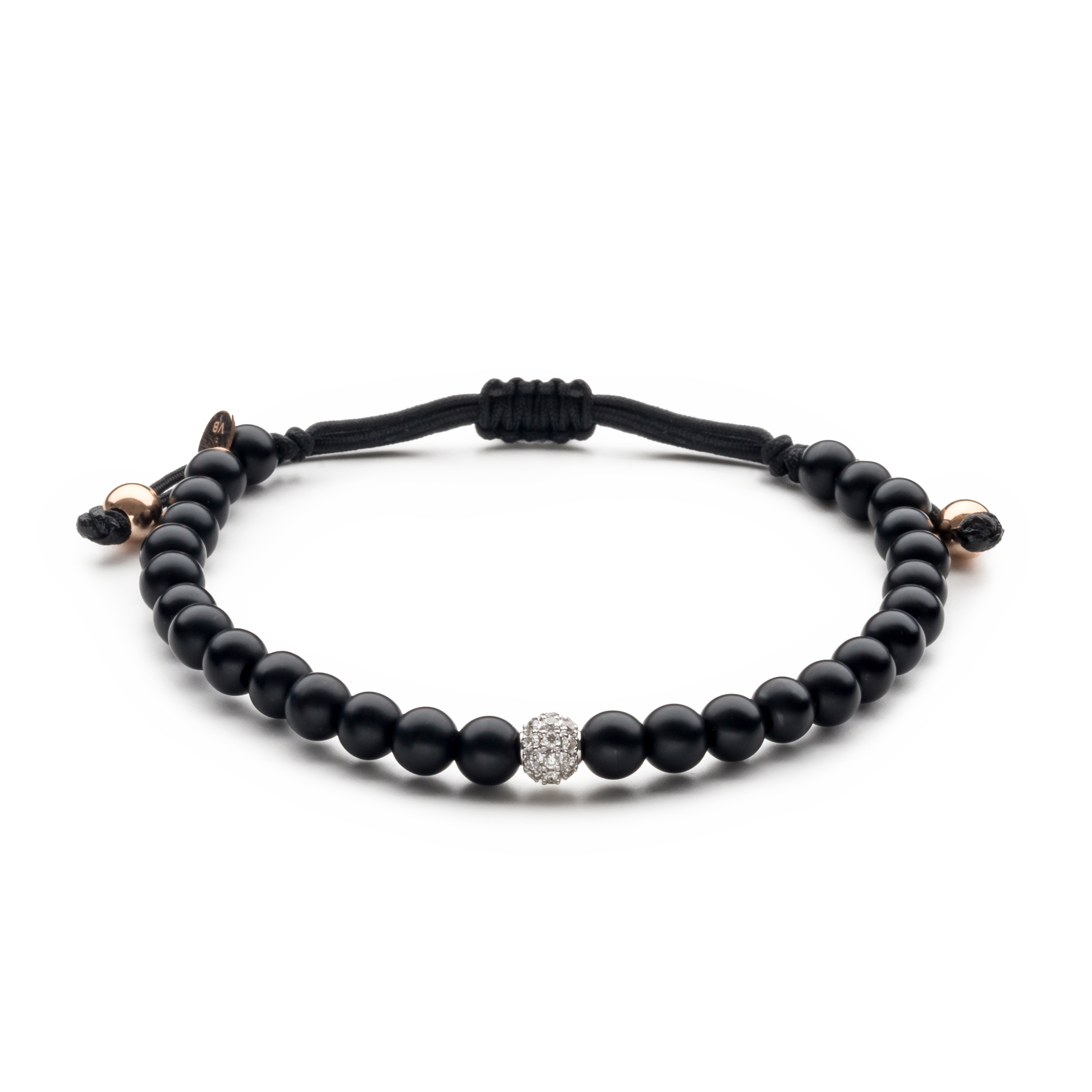 18K rose gold bracelet, onyx, 26 stones, 6mm pavé diamonds bead, Adjustable nylon cord from 15cm to 25cm