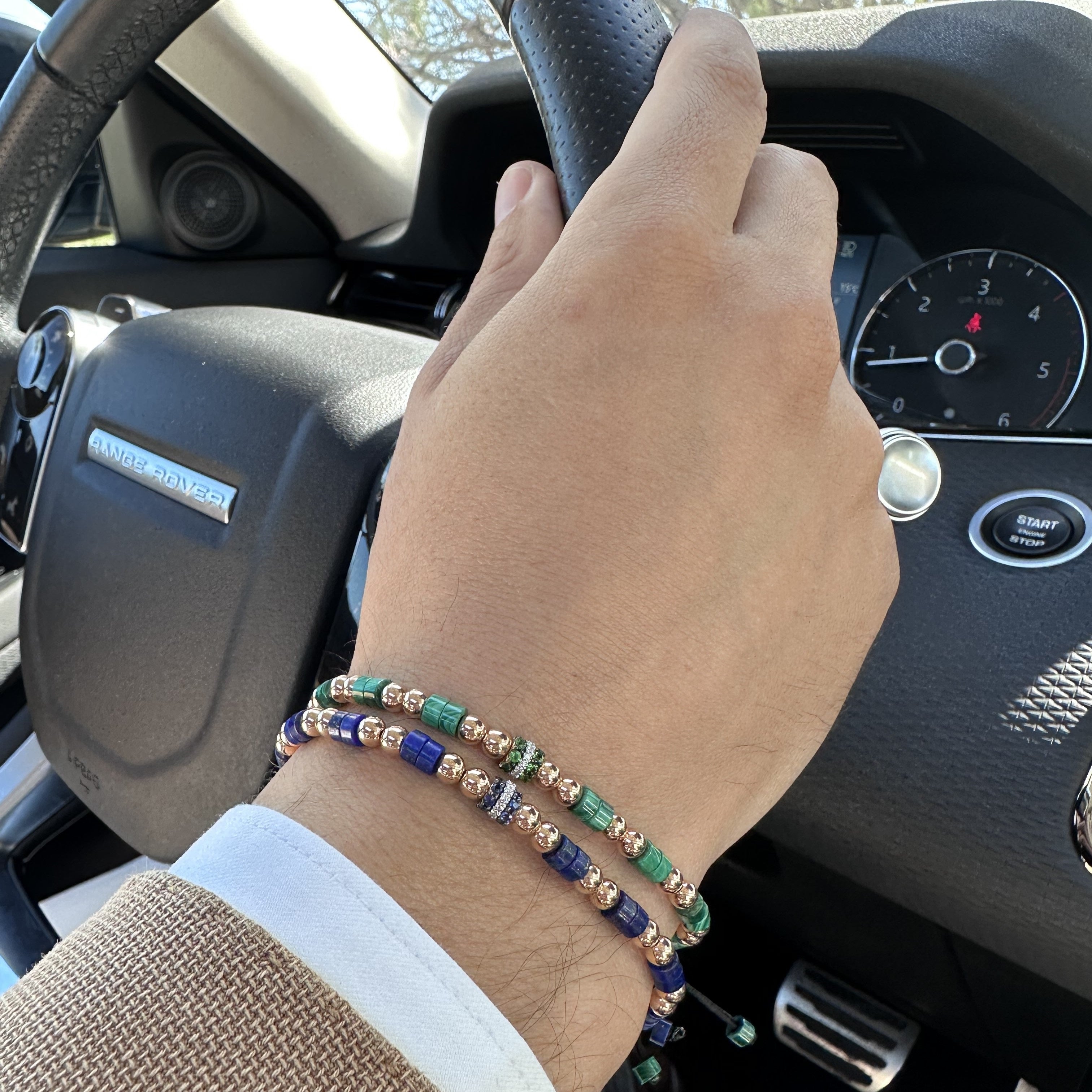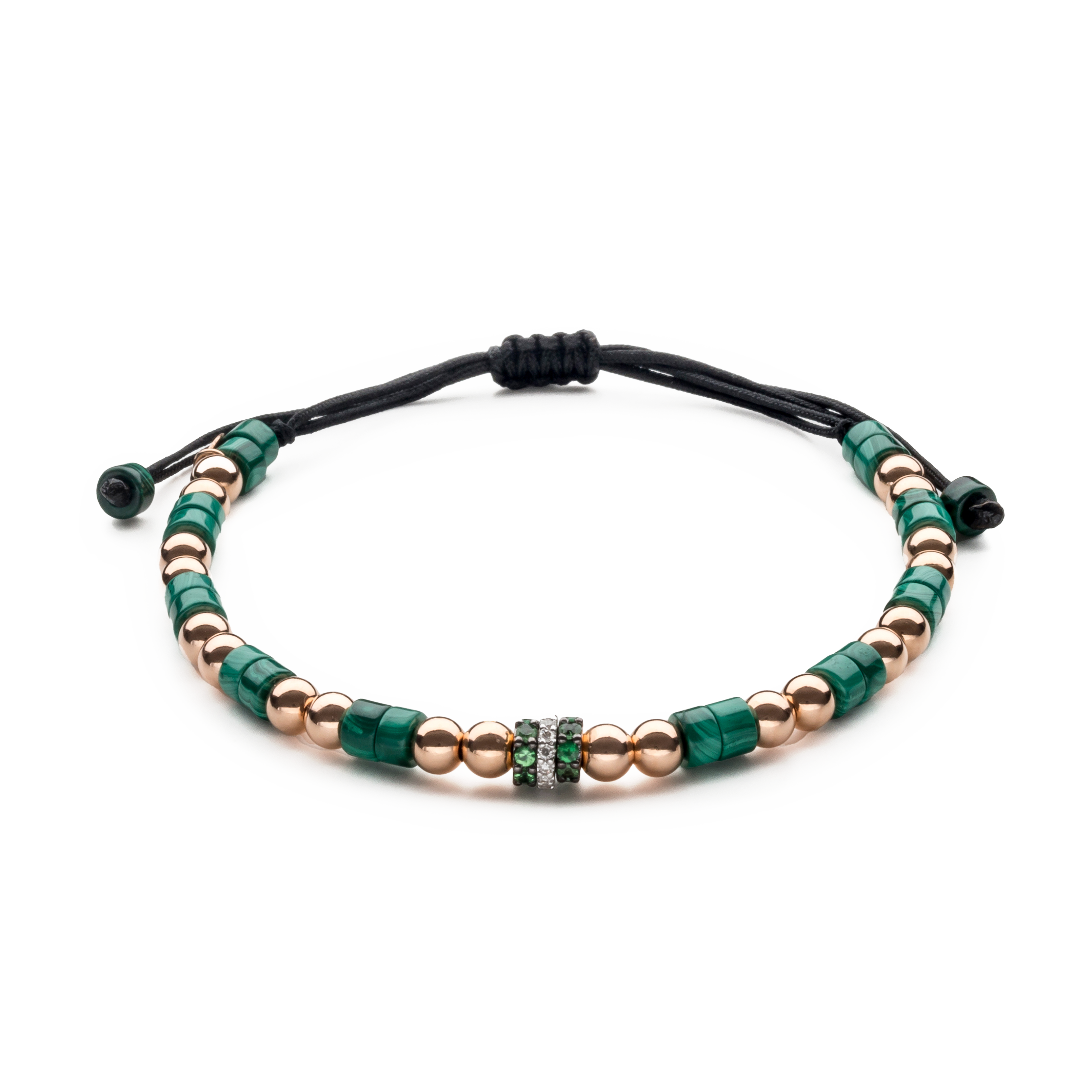 18K rose gold bracelet, malachite, 14 stones, 8/8 cut diamond wheel sapphire wheel 4mm bead, Adjustable nylon cord from 15cm to 25cm