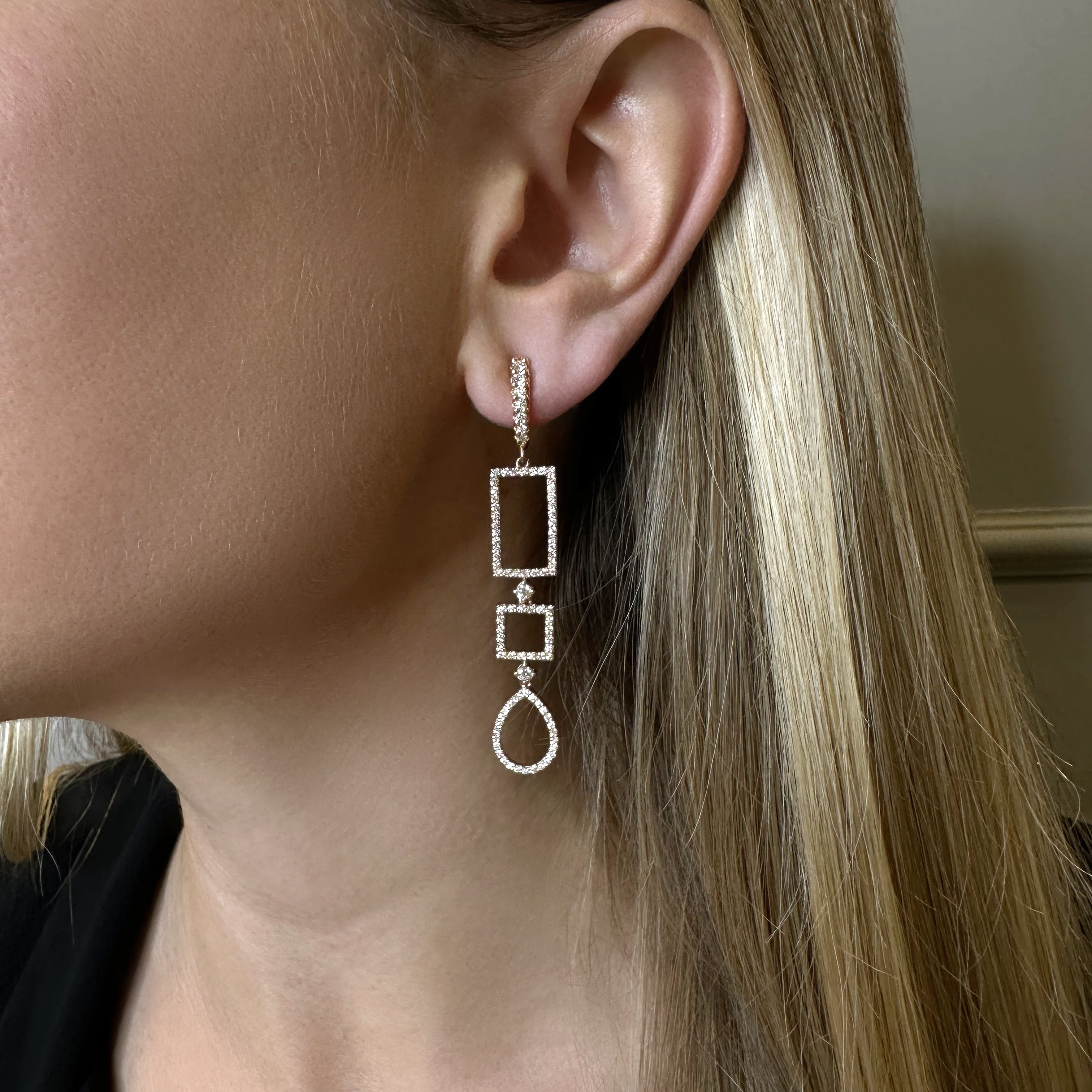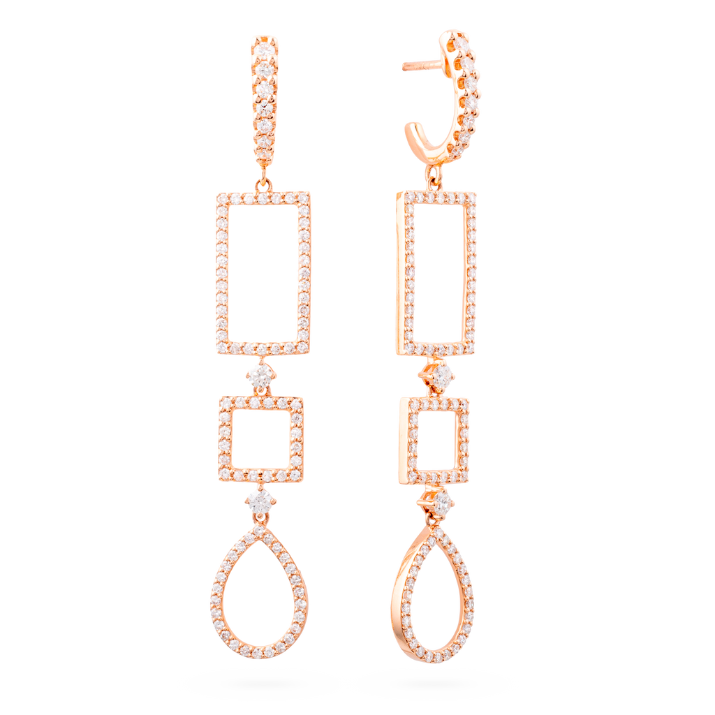18K rose gold earring, diamond color GH, clarity SI 1.45 ct, 182 stones, pressure clasp