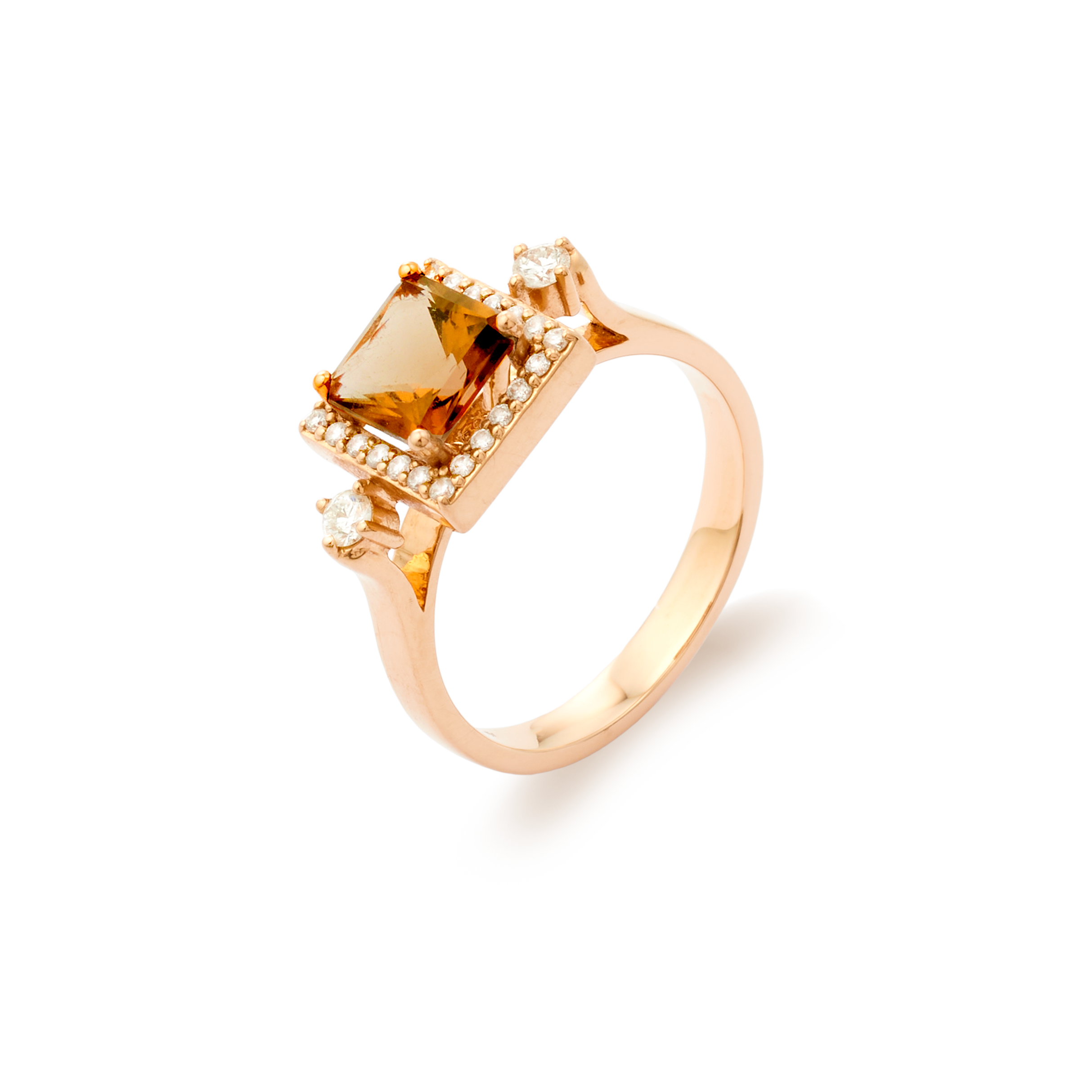 18K rose gold ring, diamond color GH, clarity SI 0.23 ct, fume quartz, 26 stones