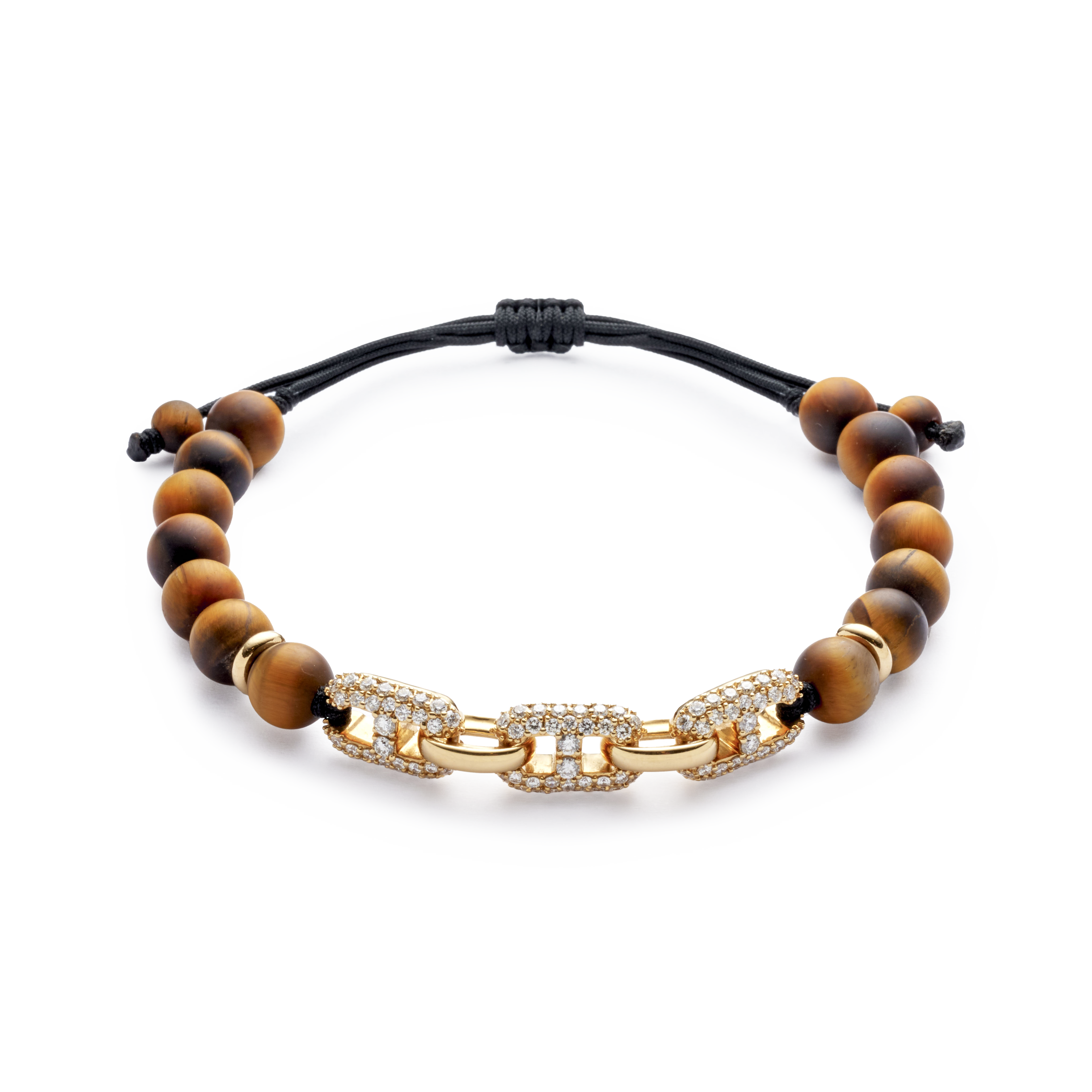 Pulsera oro amarillo 18K, ojo de tigre, 112 piedras, triple eslabón diamantes, Cordón de nailon ajustable de 15cm a 25cm