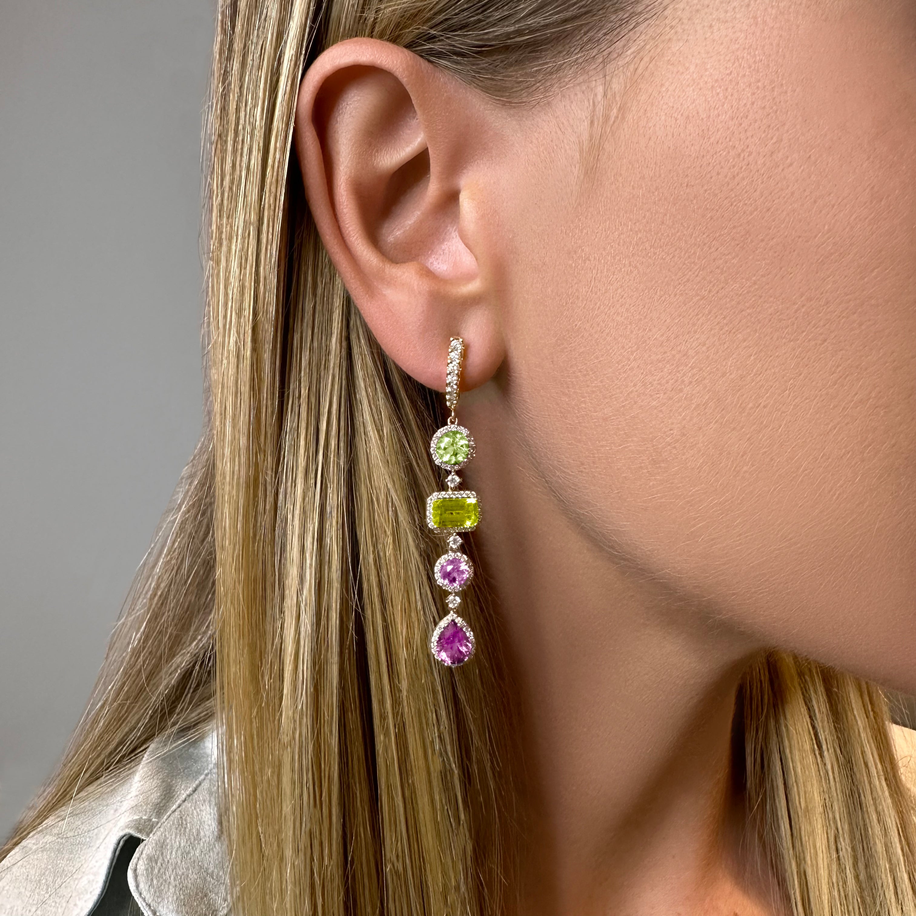Pendientes oro rosa 18K, diamante color GH, claridad SI 1.33 ct, prasiolita, peridoto y amatista, 182 piedras, cierre presión