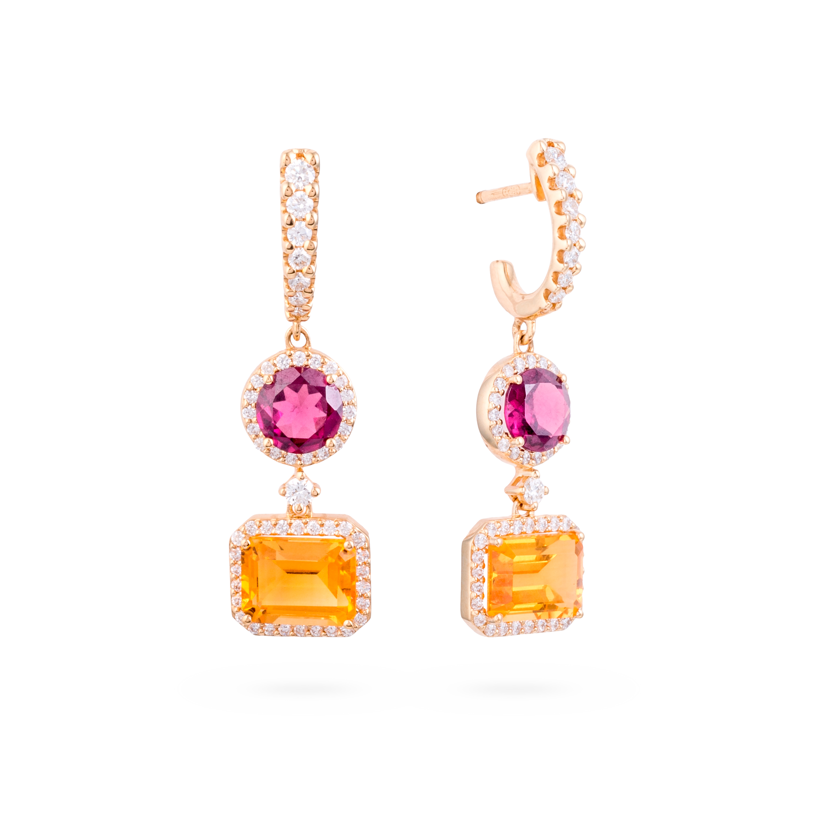 Pendientes oro amarillo 18K, diamante color GH, claridad SI 0.81 ct, citrino y rodolita, 106 piedras, cierre presión