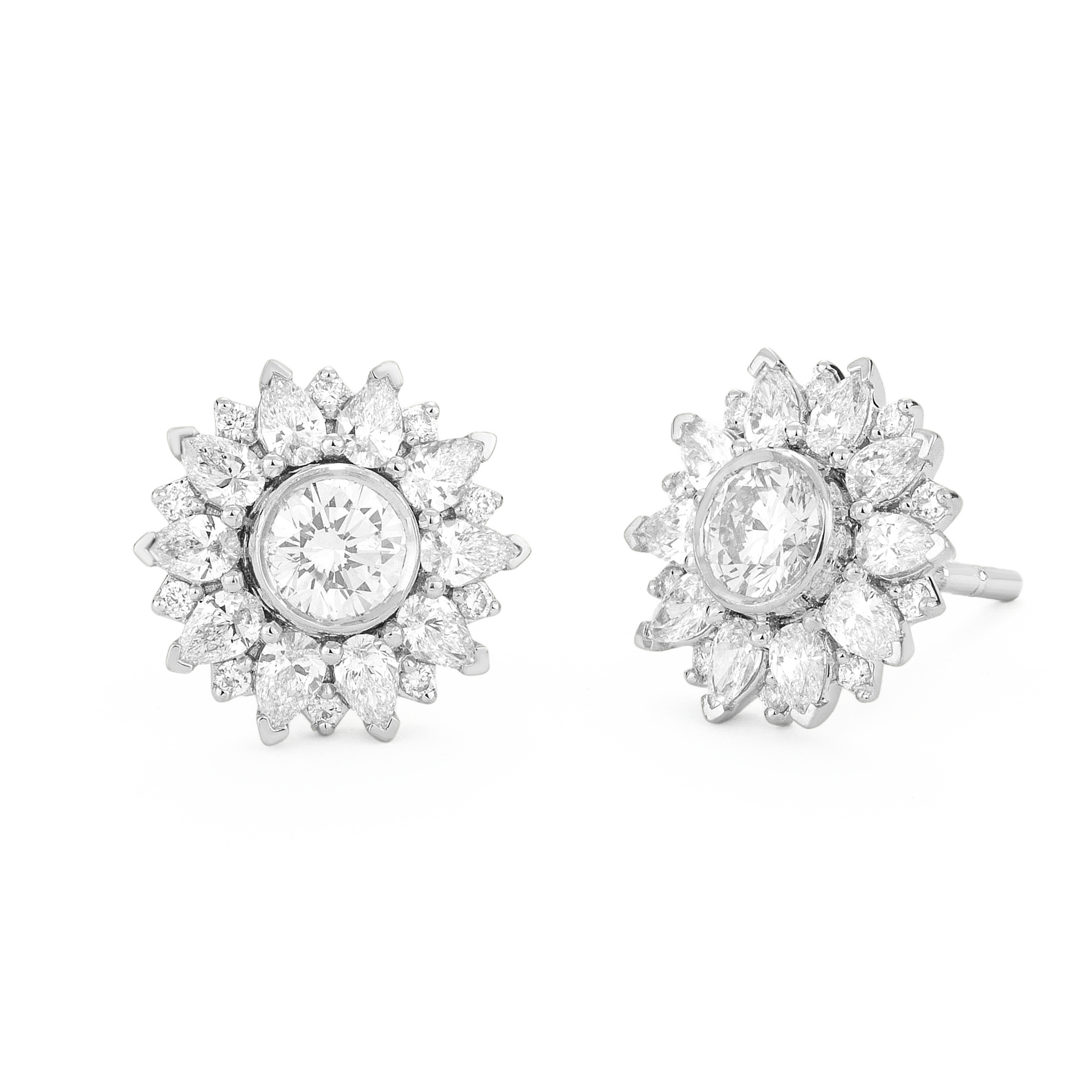 Pendientes oro blanco 18K, diamante 0.85 ct, diamante color GH, claridad SI 0.09 ct y diamante color GH, claridad SI 0.63 ct, 42 piedras, cierre presión