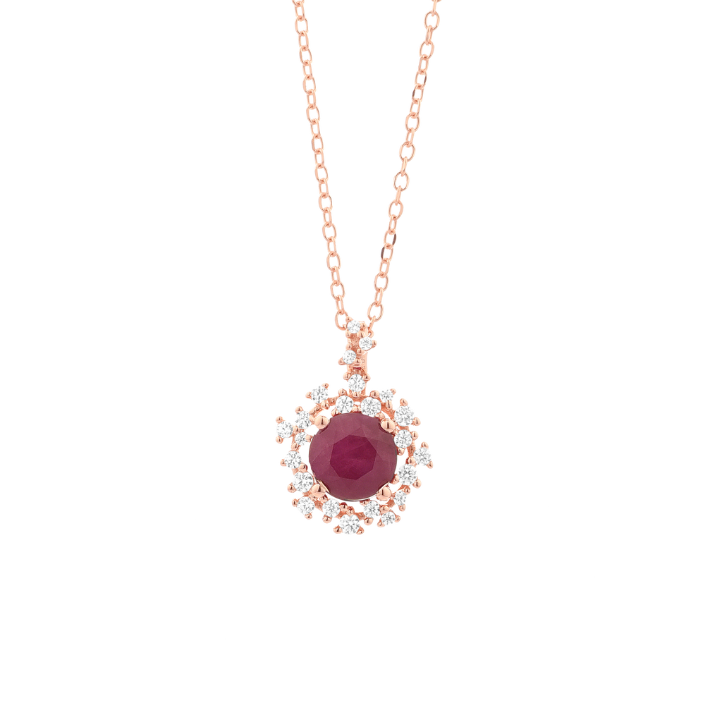 Colgante oro rosa 18K, diamante color GH, claridad SI 0.17 ct, rubi, 23 piedras, cadena rolo 42cm cierre mosqueton
