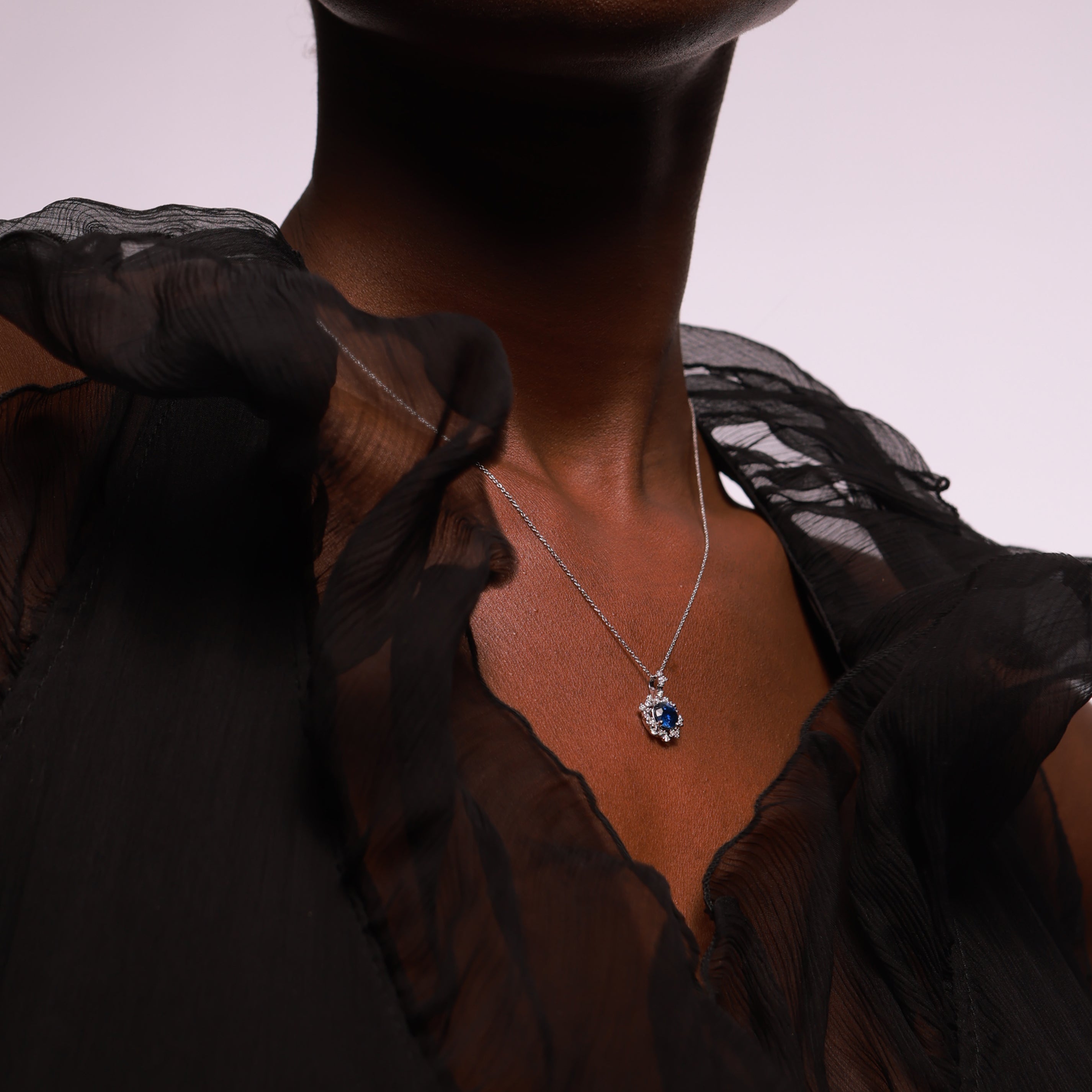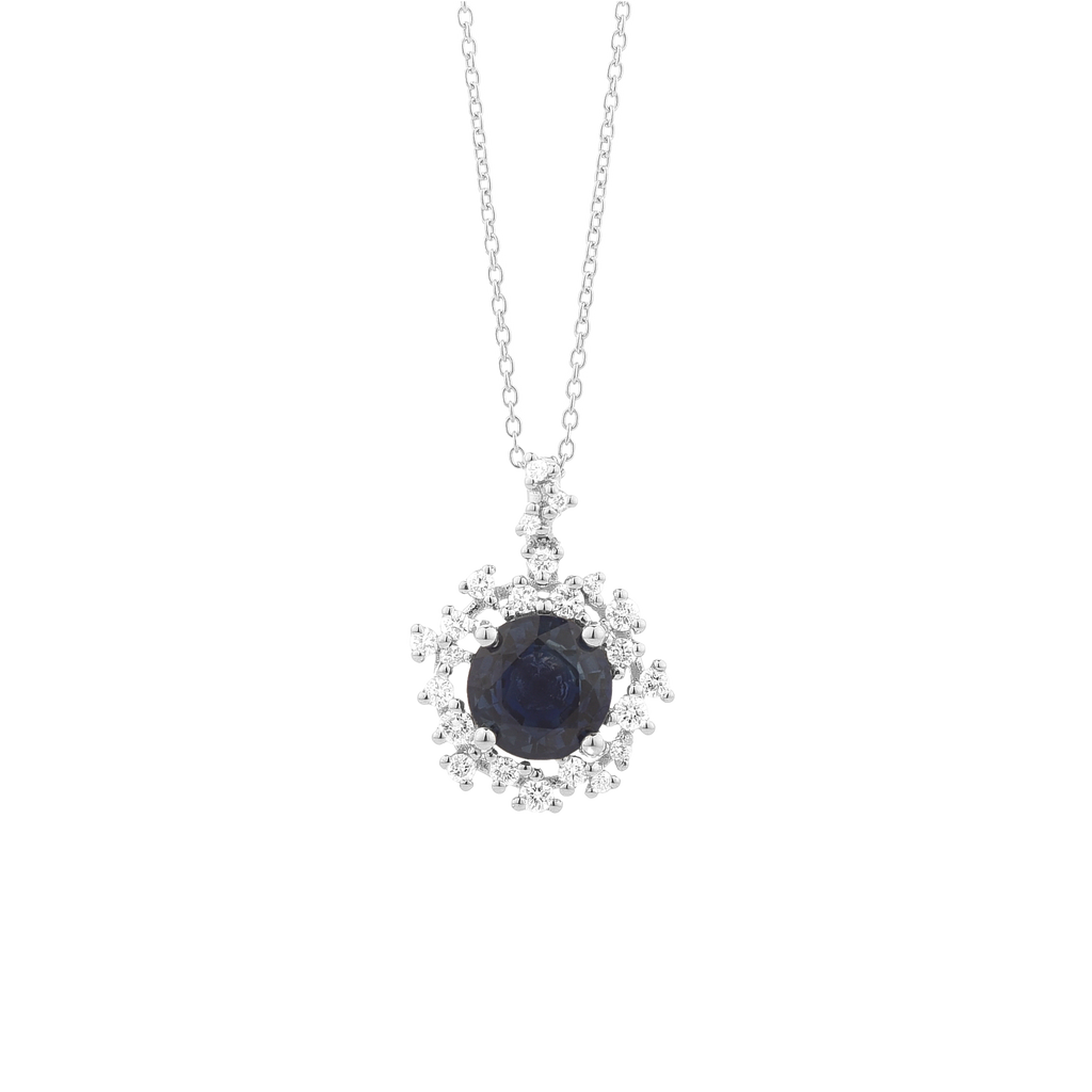 Colgante oro blanco 18K, diamante color GH, claridad SI 0.17 ct, zafiro, 23 piedras, cadena 42cm cierre mosqueton