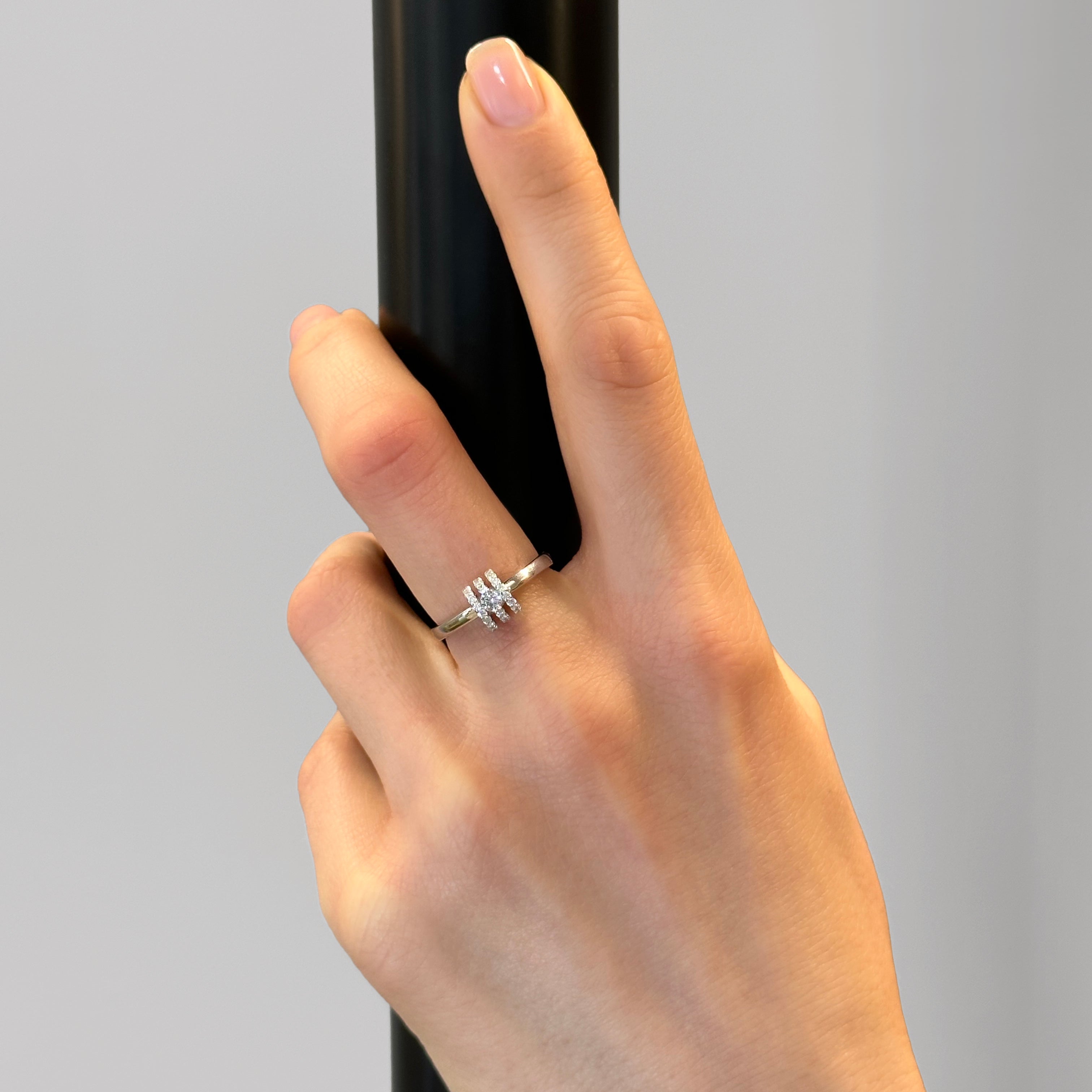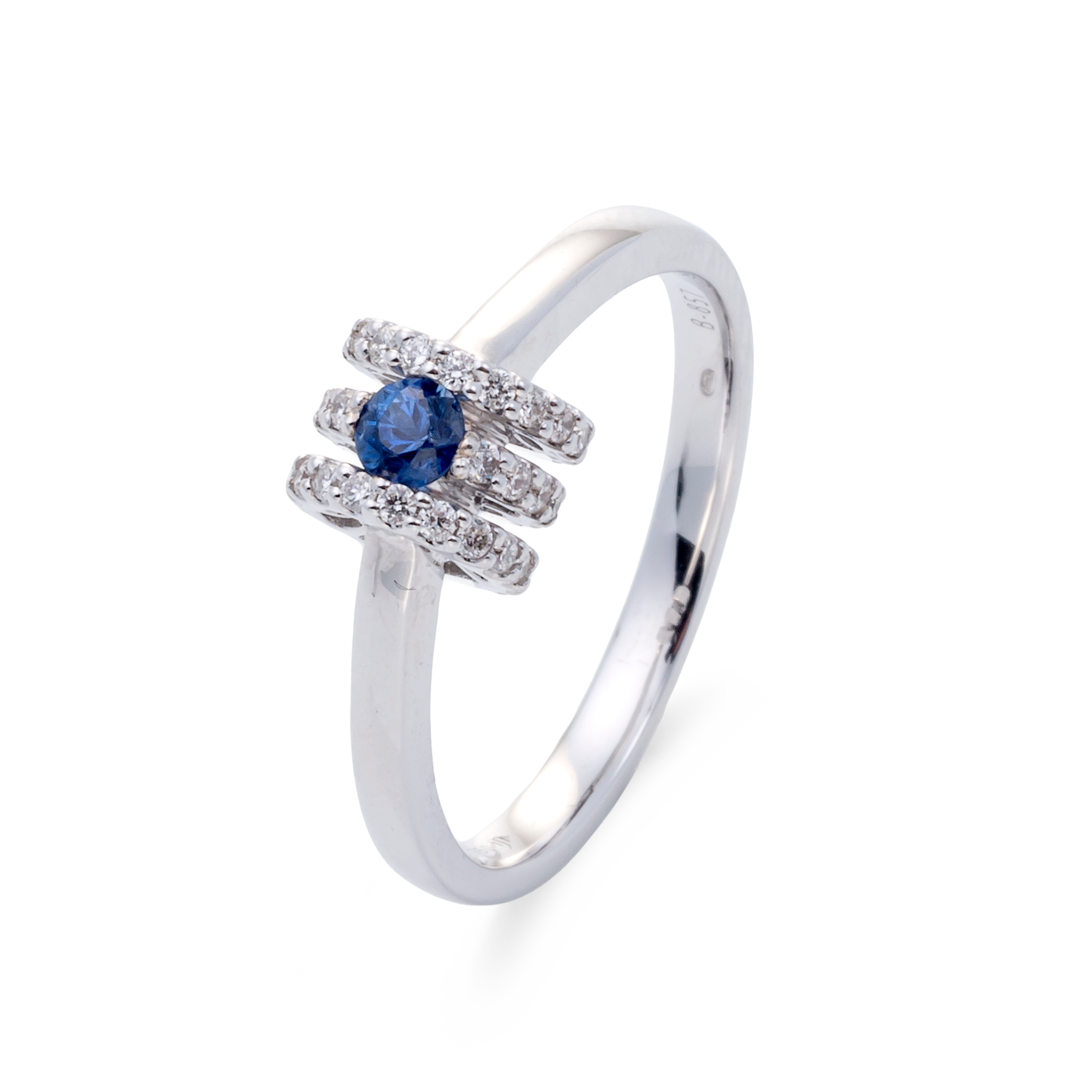 Sortija oro blanco 18K, diamante color GH, claridad SI 0.20 ct, zafiro, 40 piedras