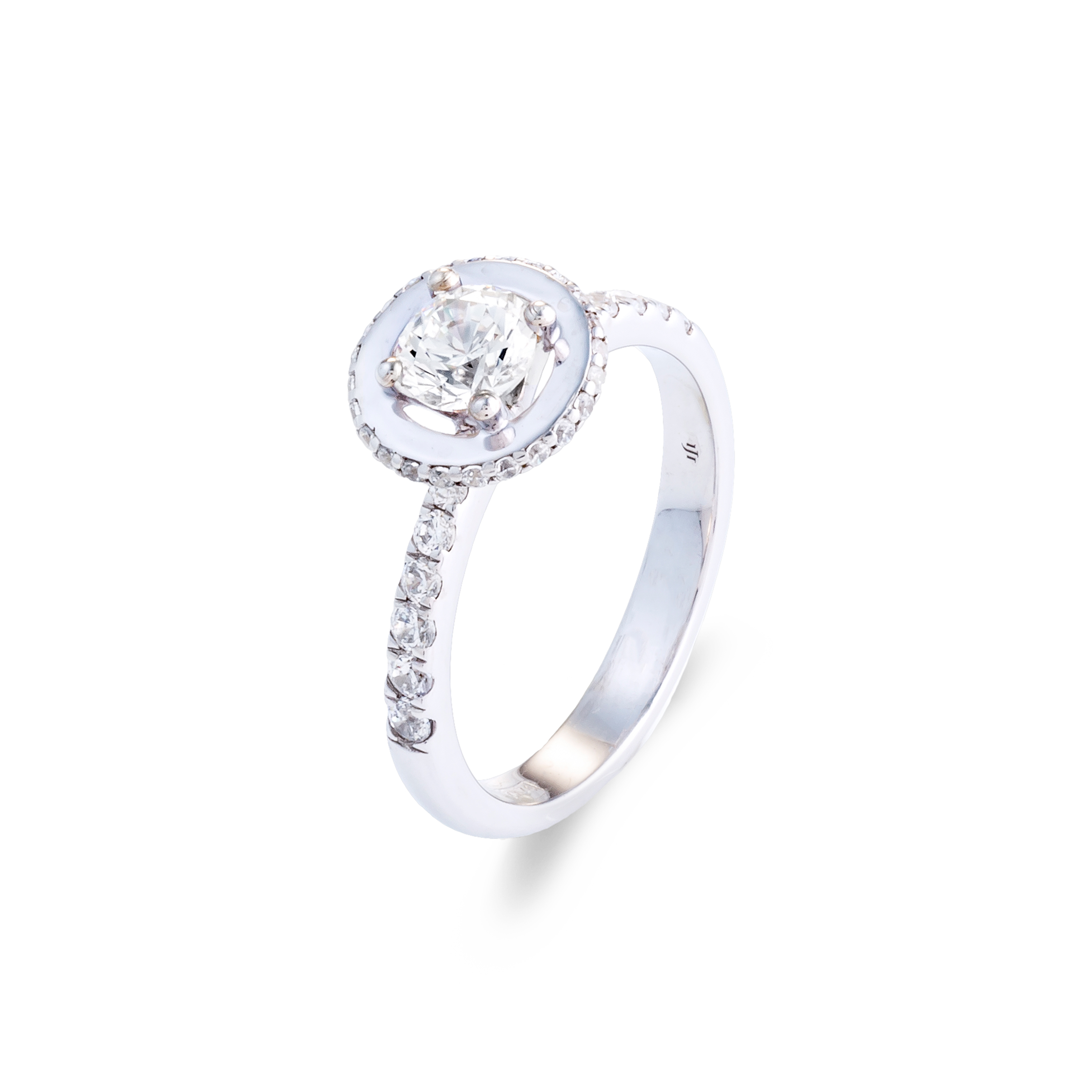 Sortija oro blanco 18K, diamante color GH, claridad SI 0.92 ct, 39 piedras