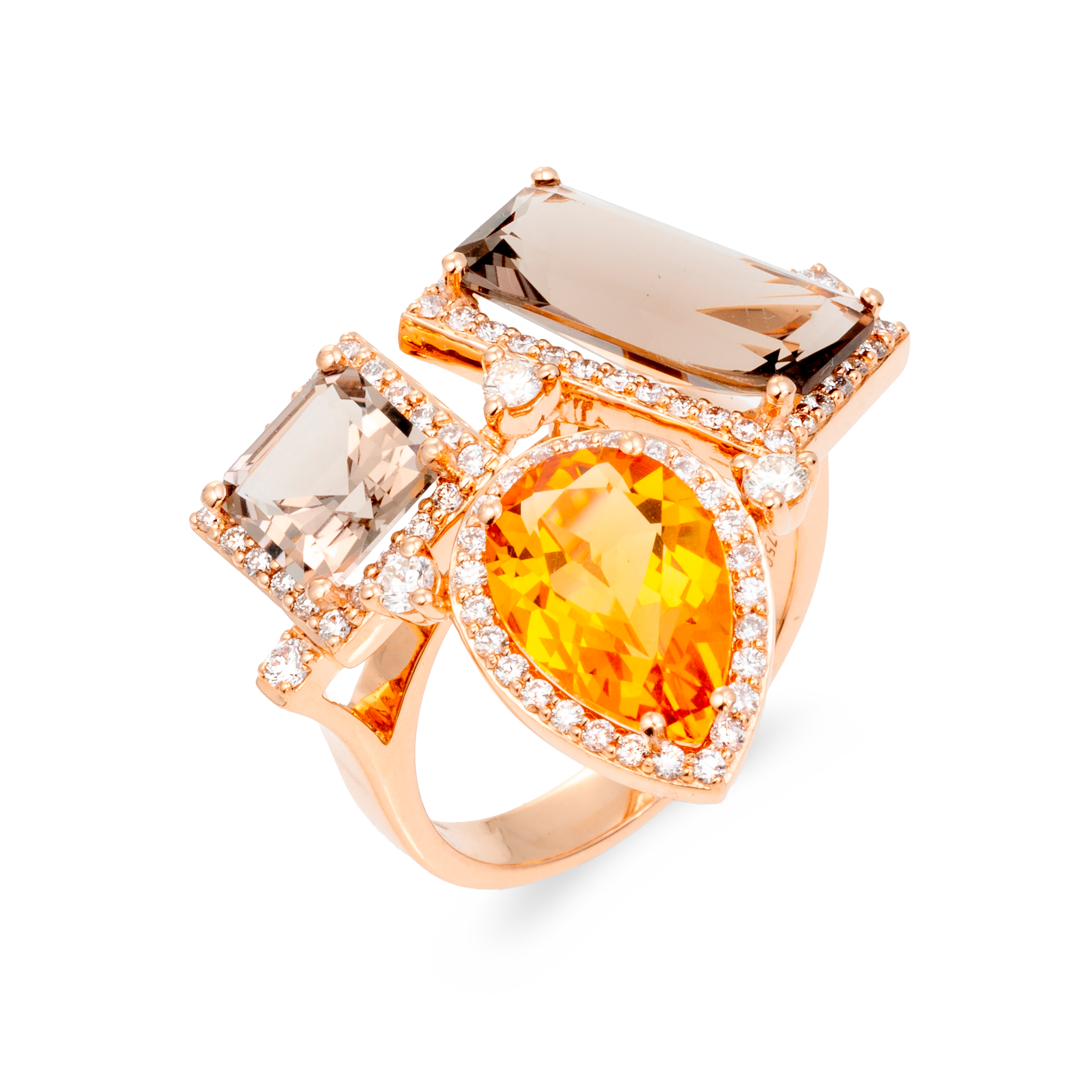 Sortija oro rosa 18K, diamante color GH, claridad SI 0.66 ct, cuarzo fume y citrino, 85 piedras