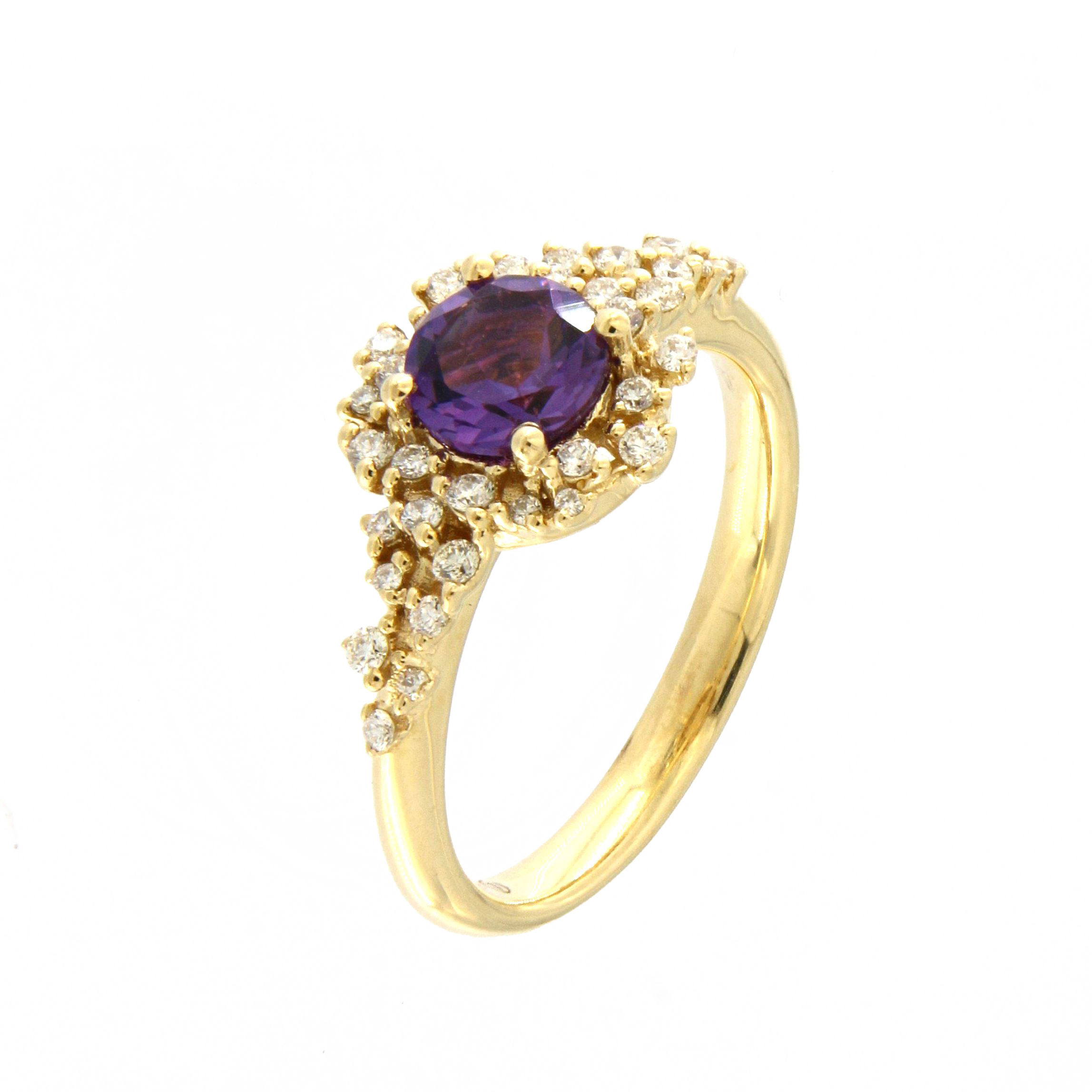 Sortija oro amarillo 18K, diamante color GH, claridad SI 0.27 ct, amatista, 33 piedras